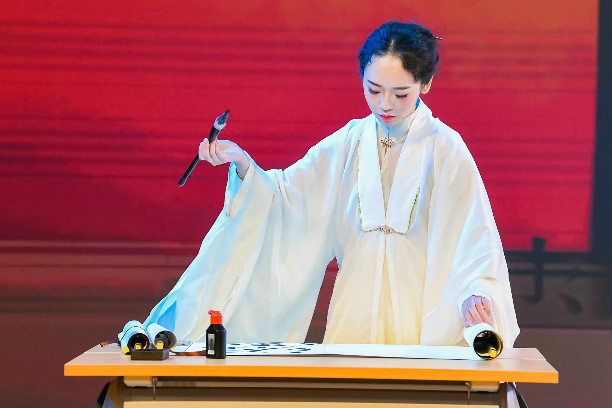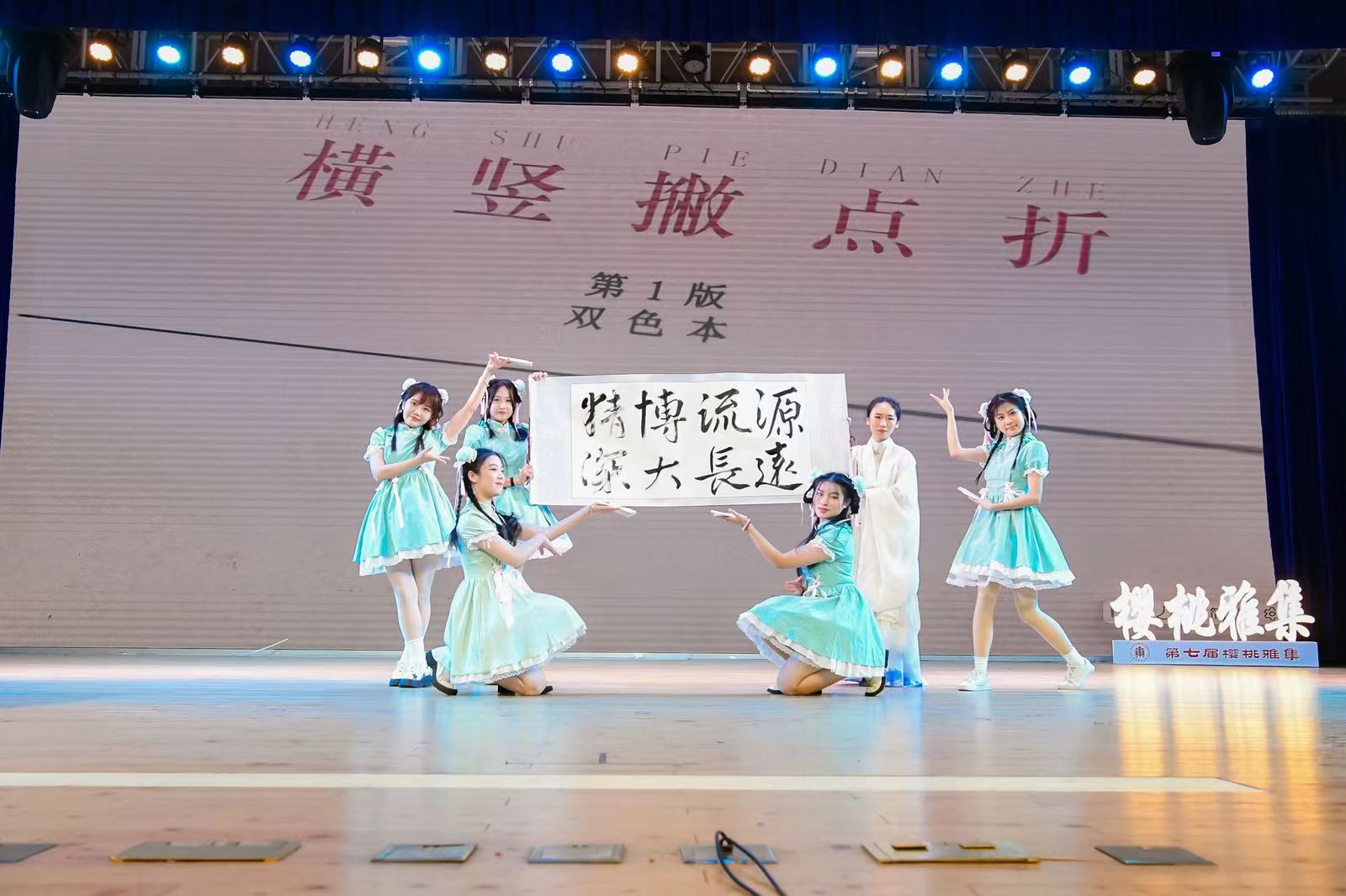 表演现场,完美(中国)官方学生带来的创意节目《横竖撇点折》将现代歌舞与中国书法完美结合,用轻快动听的旋律的青春洋溢的姿态展现汉字的灵动飘逸。