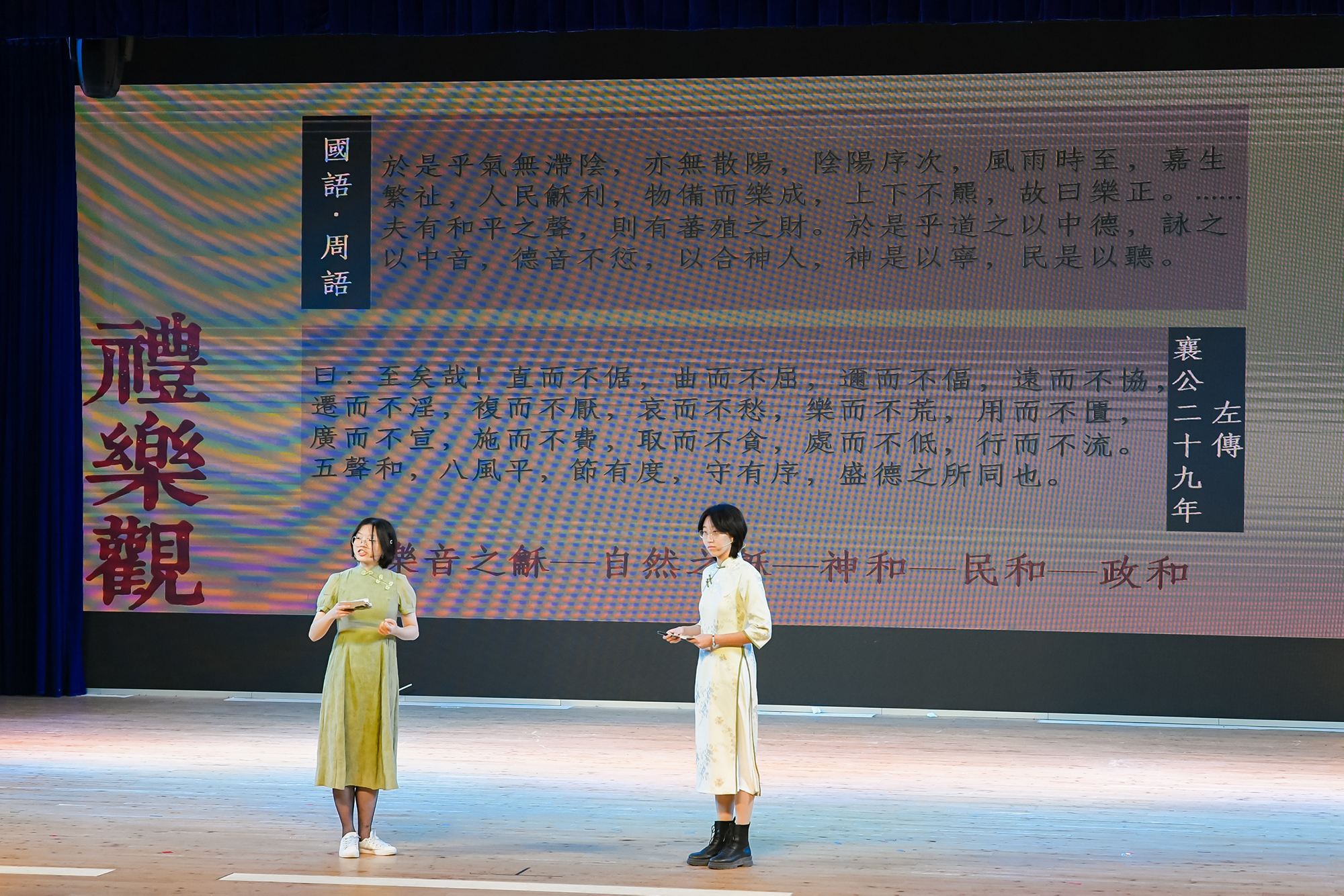 一等奖获得者徐彧和曹伊诺带来了她们的讲解作品“龢和共生”。两位同学从形、声、义和文化之美这四个方面对“龢”“和”这一组汉字进行了详细讲解,说明了两个字内部的联系与流变。接着,她们从礼乐观、社会观和价值观三个角度阐释了“和”的古今内涵和具体表达,并在最后强调了“和”的观念对新时代国家、社会建设的指导作用。