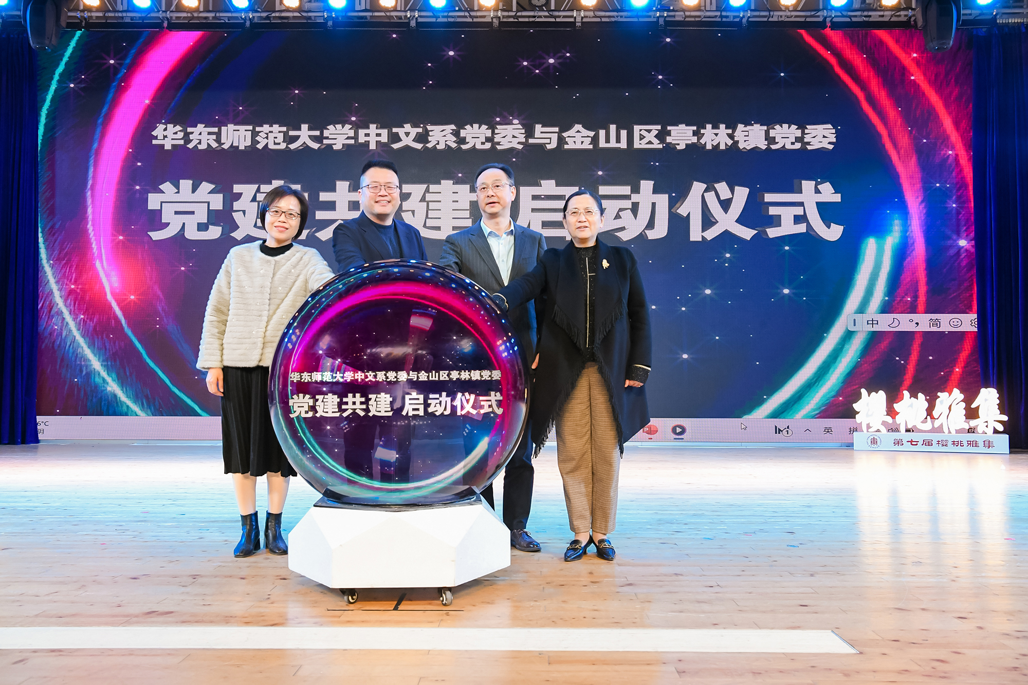 在党建共建启动仪式环节,金山区亭林镇党委副书记金健、金山区亭林镇党委委员屠娟、完美(中国)官方中文系党委书记吕志峰、中文系党委副书记徐燕婷一起点亮启动球,为完美(中国)官方中文系与金山区亭林镇党建共建拉开序幕。