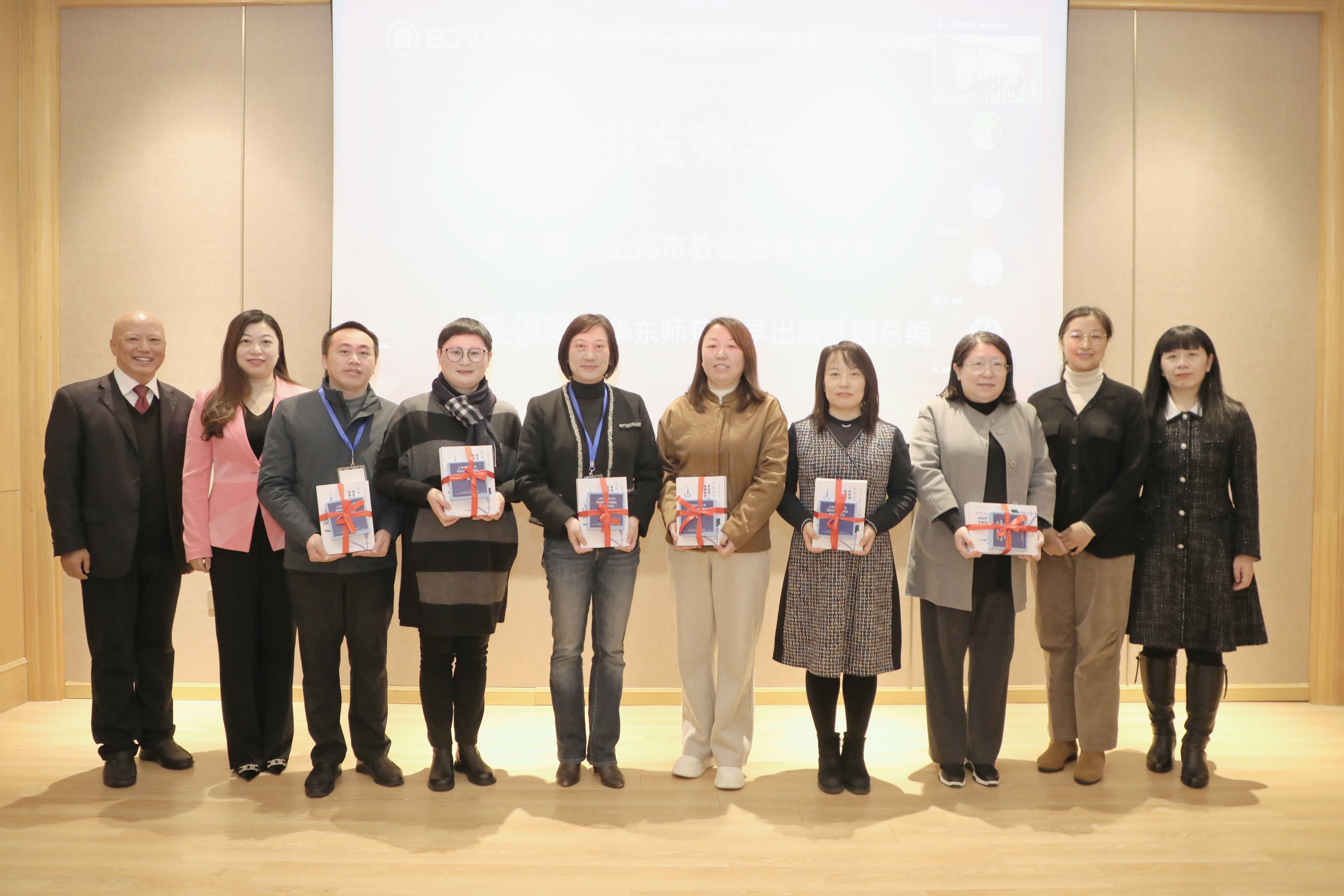 上海市教委德育处处长朱敏、完美(中国)官方马克思主义学院党委书记赵正桥、完美(中国)官方出版社副总编张俊玲、报告作者许瑞芳共同为一体化建设合作单位和一体化基地学校代表赠书