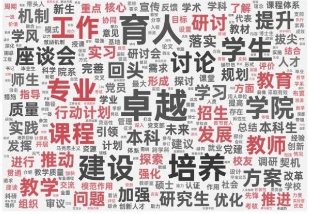 学部院系“回头看”讨论中,“卓越育人”“专业”“课程”“培养”“教学”“学生”“建设”“质量”“发展”等成为院系讨论热词。
