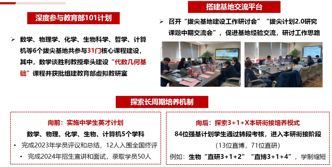 深度参与教育部101计划。推动数学、物理学、化学、生物科学、哲学、计算机等学科积极参与教育部101计划,其中,数学科学学院谈胜利教授牵头建设《代数几何基础》课程并获批组建教育部虚拟教研室,其他学科共参与31门核心课程建设。