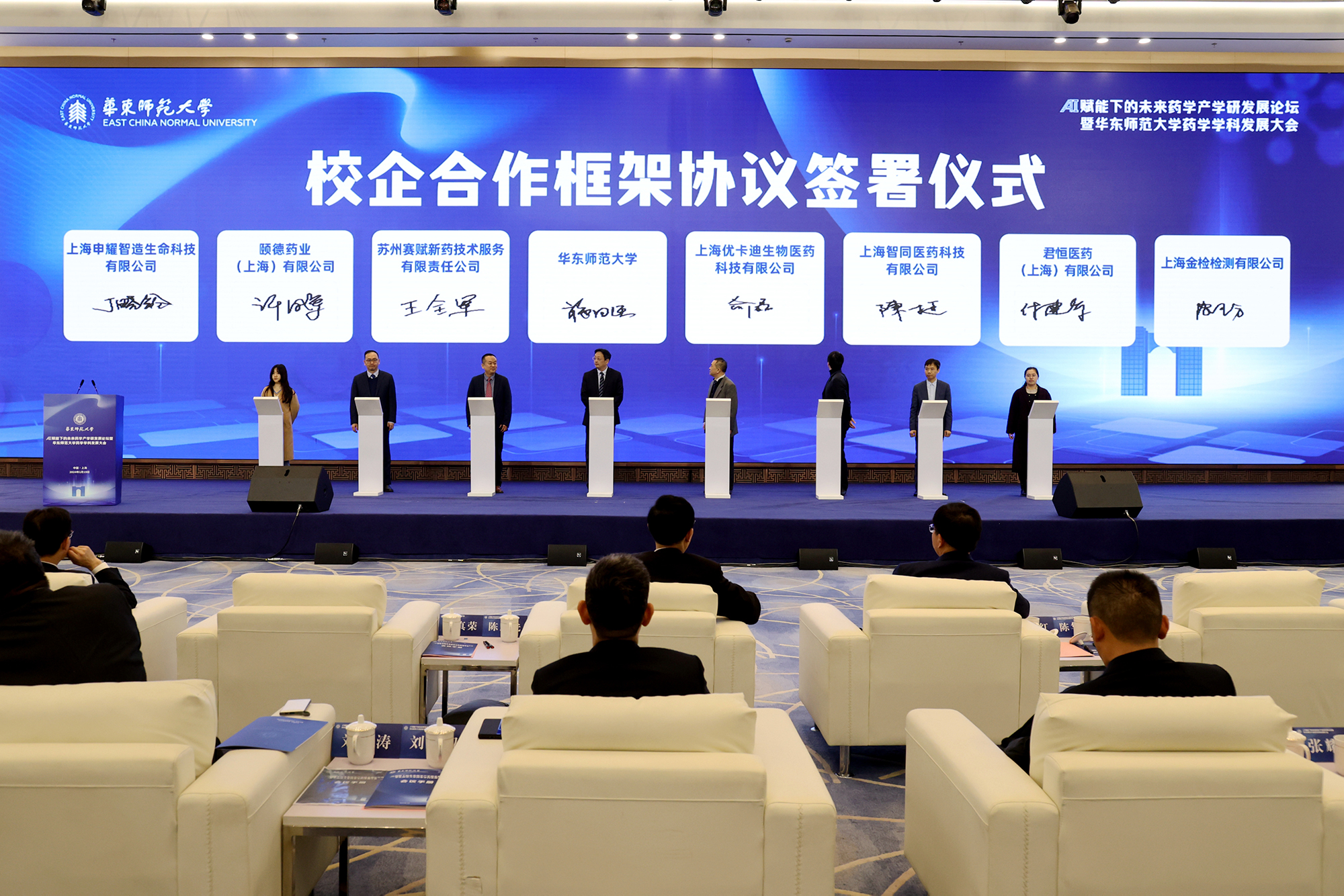 会上,学校还和包括上海医药集团股份有限公司、华润医药集团有限公司、华润生物医药有限公司、奥锐特药业股份有限公司、苏州赛赋新药技术服务有限责任公司、颐德药业(上海)有限公司、上海皓元生物医药科技有限公司、药源药物化学(上海)有限公司、君恒医药(上海)有限公司、上海智同医药科技有限公司、上海优卡迪生物医药科技有限公司、迈威(上海)生物科技股份有限公司等十余家生物医药企业签订了合作协议。