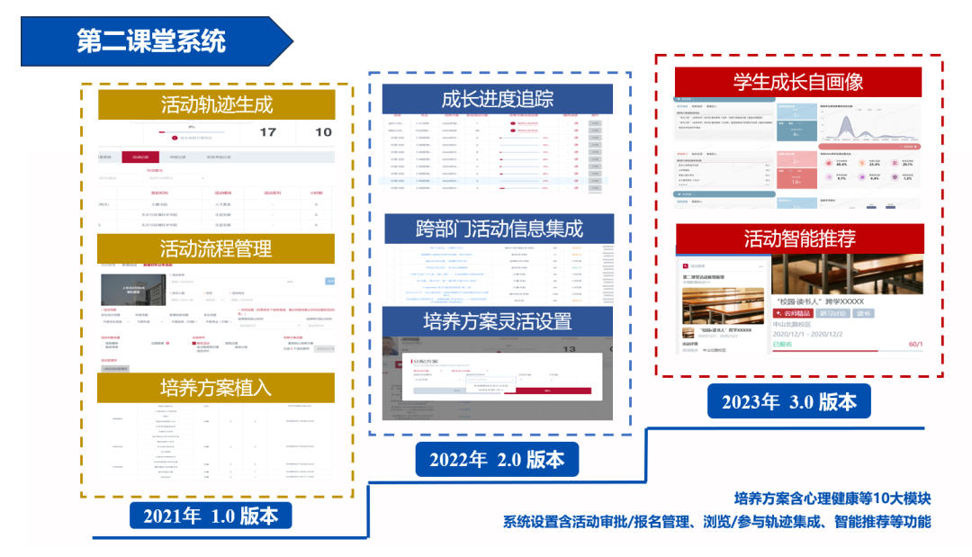 “第二课堂”学生成长档案平台围绕学生思想素质、志愿服务、社会实践、心理健康、体育运动、美育实践、全球胜任力、生涯发展、人文素养、创新创业模块活动,结合各类数据进行学生群像描绘,特别是对“奋进群体”“学霸群体”“新生群体”等画像,帮助专业教师和辅导员准确把握学生综合表现动态,及时有效地关注不同学生群体,并提供学业发展和素养达成等方面的精准指导。