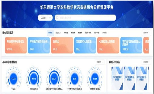 建成教学状态数据综合分析管理平台,以大屏可视化方式对教学相关核心指标进行展示、对比和预警,形成学校、学院、专业三级年度数据分析报告,辅助学校开展教学审核评估、师范专业认证、工程认证和新文科专业认证等相关工作,为专业动态调整提供数据依据,全面加强学校教学质量监测。