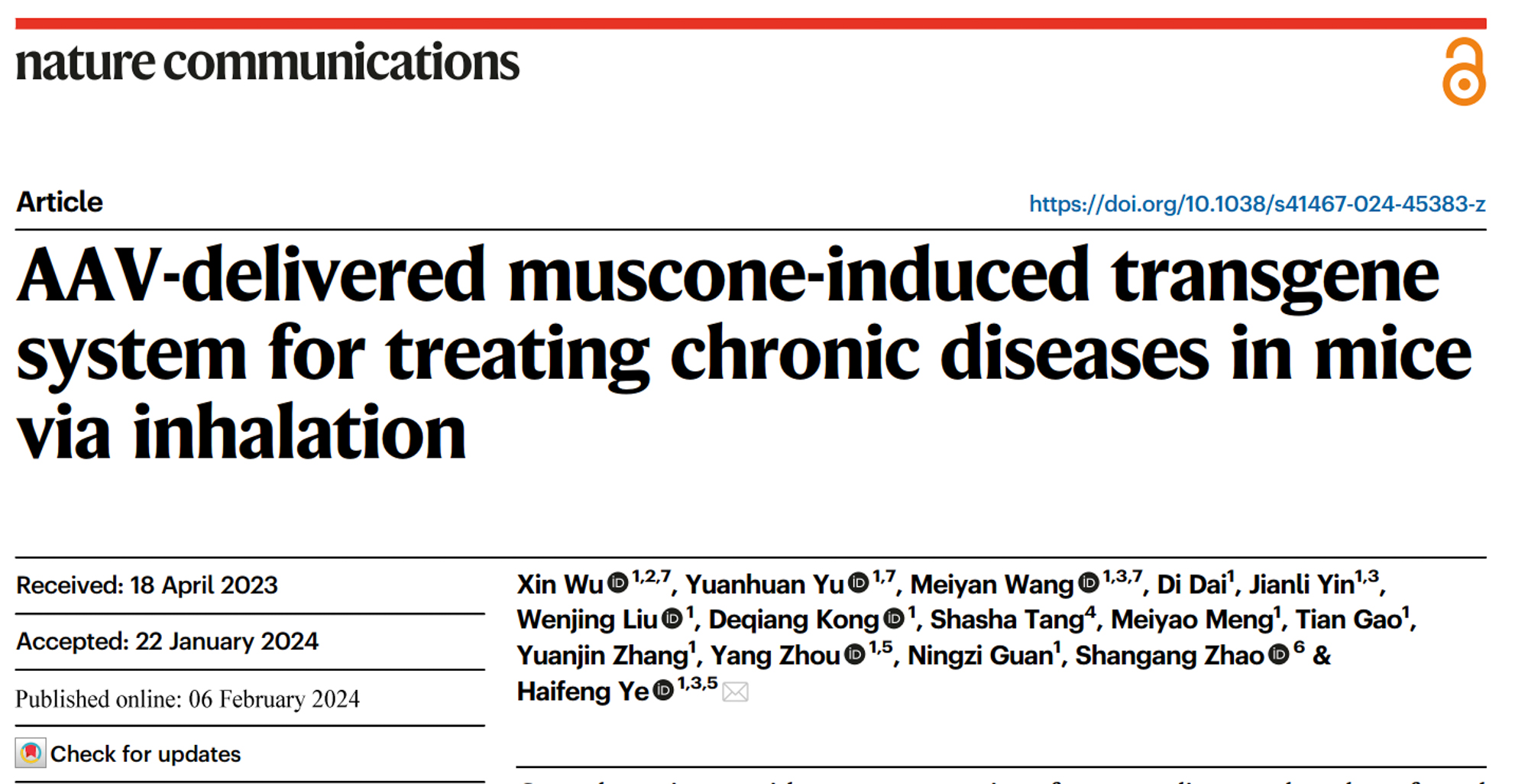 完美网页版生命科学学院叶海峰研究团队成功开发了“香气分子”麝香酮(muscone)调控的基因表达精准控制系统,并将其装载在腺相关病毒AAV基因治疗载体中(命名为AAVMUSE),实现无针无痛、患者依从性高的可控式基因疗法。这一创新成果“AAV-delivered muscone-induced transgene system for treating chronic diseases in mice via inhalation”于2024年2月6日发表在国际期刊 Nature Communications。