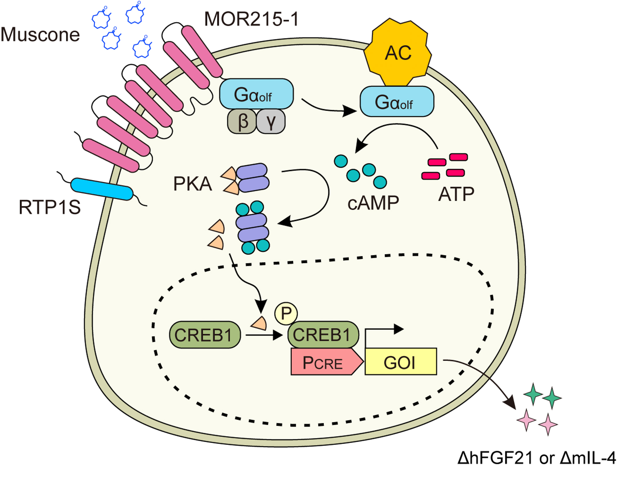 芳香疗法在日常生活中常用于心理疾病治疗,通过吸入芳香精油,能够缓解压力,舒缓心情,研究者试想能否将该“闻香疗法”应用于慢性疾病中?麝香酮是中药材麝香的主要活性成分,是一种具有挥发性和香气的临床药物,已被国家批准用于食品、药品、以及香水中。鉴于麝香酮的安全性、挥发性,研究人员基于感应麝香酮的小鼠嗅觉受体MOR215-1和合成的cAMP响应的启动子(PCRE),在体外成功构建了低背景、高诱导的麝香酮调控的基因环路(muscone-regulated gene circuit, MUSE)。当麝香酮与G蛋白偶联受体MOR215-1结合后,激活胞内的cAMP信号通路,随后使得响应cAMP的结合蛋白1(cyclic-AMP response binding protein, CREB1)磷酸化后结合到PCRE启动子上,进而启动目的基因表达(图1)。体外验证结果显示,麝香酮与细胞在没有直接接触的情况下,麝香酮自身的挥发性,可以实现远程调控基因的表达。