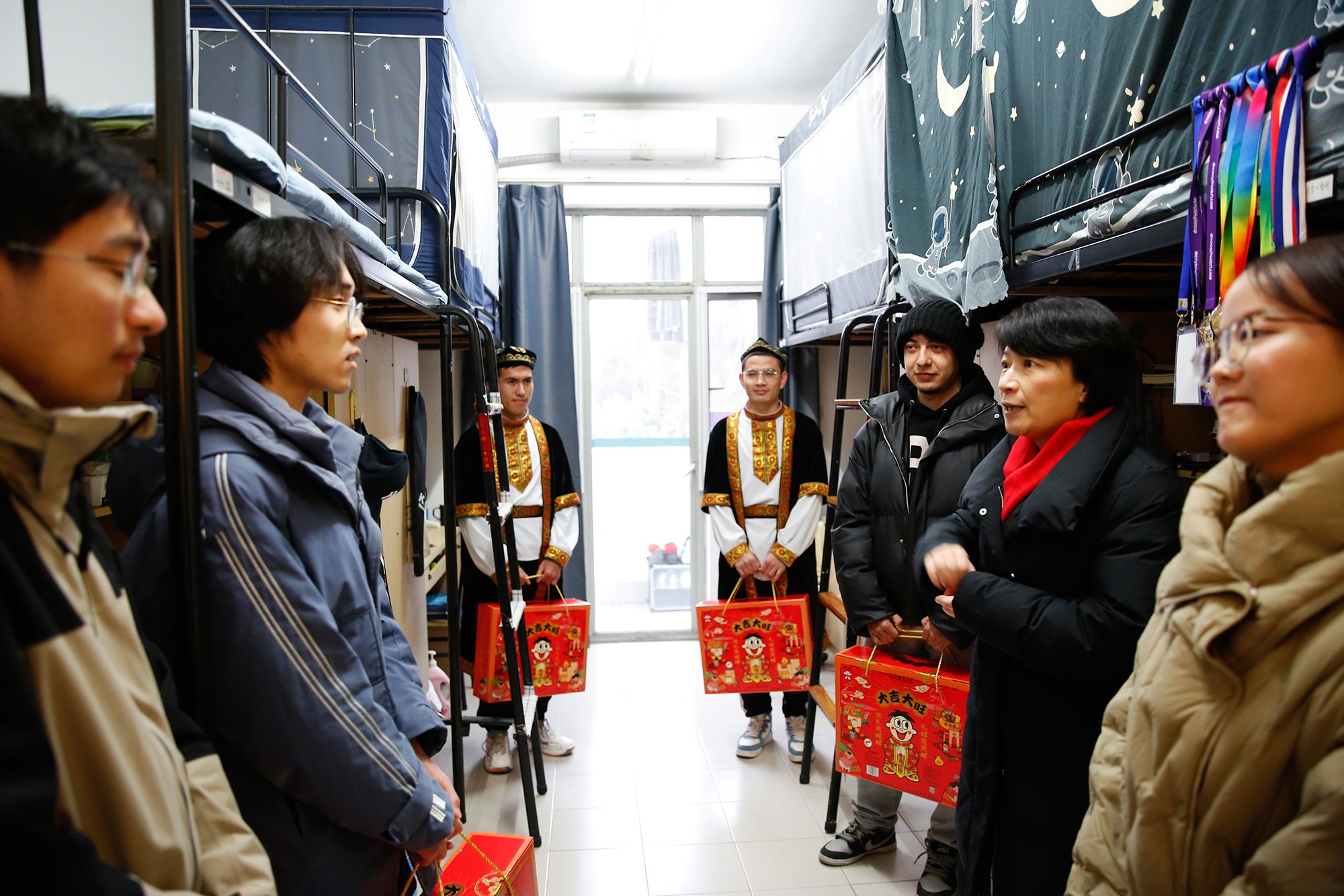 校领导来到总值班室、门岗、保卫处、校医院、车队、环境科等一线岗位,亲切慰问节日期间坚守在工作岗位的安全管理、后勤保障和医疗工作人员,对他们的辛勤付出表示衷心感谢,并为他们一一送上节日慰问品。校领导还前往图书馆、本科生公寓、留学生公寓、食堂餐厅等处,了解寒假留校学生的学习和生活情况,叮嘱工作人员关爱留校学生,做好后勤及安全保障工作,确保学生们愉快温暖的欢度佳节。
