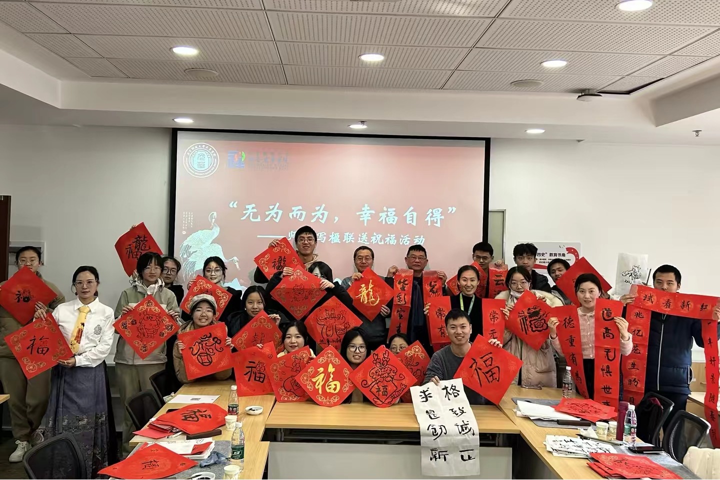 光华书院与社会发展学院在闵行校区联合举办了“无为而为,幸福自得”师生写楹联送祝福活动。师生在学生社区共同书写楹联和创意龙字福,并分别展示和讲解了各自作品创作过程及背后美好的寓意,共同体悟老子思想与民俗传统,用笔墨书香传递对幸福生活的向往,共迎佳节。