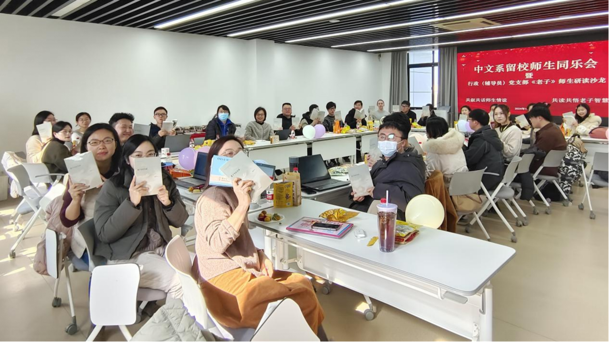 在中文系留校师生同乐会暨行政(辅导员)党支部《老子今注今译》师生研读沙龙上,中文系部分教师与寒假留校的本、硕、博学生欢聚一堂。在场师生共同研读陈鼓应先生所著的《老子今注今译》。留校学生就毕业论文写作、未来职业规划、在校生活感悟等方面进行分享,在场老师对同学们的困惑提出建议,叮嘱学生放平心态,利用假期调整生活节奏,多与同学和老师沟通交流。