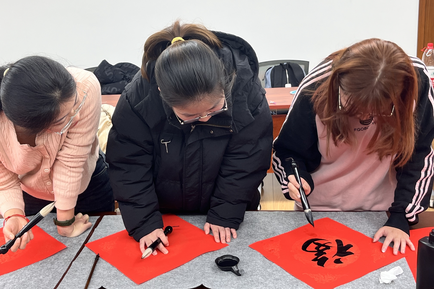 化学与分子工程学院举办了“书香辞旧岁,翰墨迎新春”师生活动。活动现场,墨香四溢,到场师生一同开笔并练习执笔手法后,便迫不及待地投入春联和福字的书写,用笔墨勾勒出一撇一捺,写下心中的一字一句,有对未来一年的美好祝愿,有对科研毕业的满心期待,还有对健康快乐的美丽祝福,处处洋溢着喜庆祥和的欢乐气氛。
