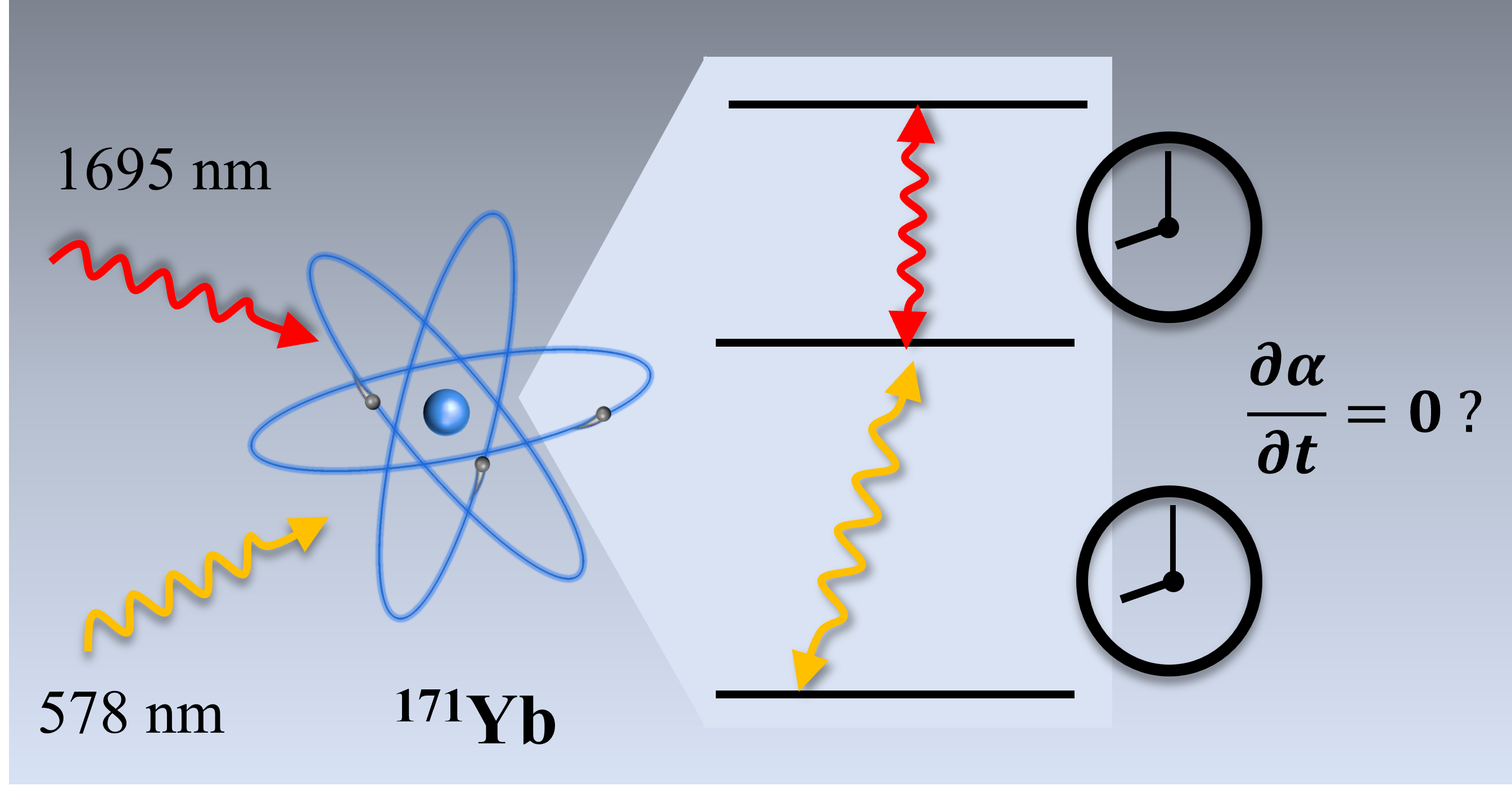 徐信业教授指出,这仅仅是研制内壳层镱原子光钟刚迈出的第一步,后续还有许多难关需去攻克。尽管目前研制的镱原子光钟还有许多不足之处,但他们充满信心,还会继续努力。由于内层电子受到外层电子的隔离,能减弱外场对其扰动,因此,内壳层原子光钟有望在性能指标上超越目前基于外层电子的原子光钟,从而为我国在即将到来的秒定义修改中争得话语权而创造更有利条件。目前这项工作意义还在于将为当前我国开展前沿性基础物理研究提供一种超高精度的测量手段,从而有助于增强我国在前沿性基础物理研究领域的国际竞争力。比如与课题组前期已研究成熟的578nm钟跃迁结合,构建成双钟频镱原子光钟,如图3所示,可以前所未有的测量精度探询精细结构常数是否随时间变化,这将为检验现有物理理论是否正确提供十分重要的依据。