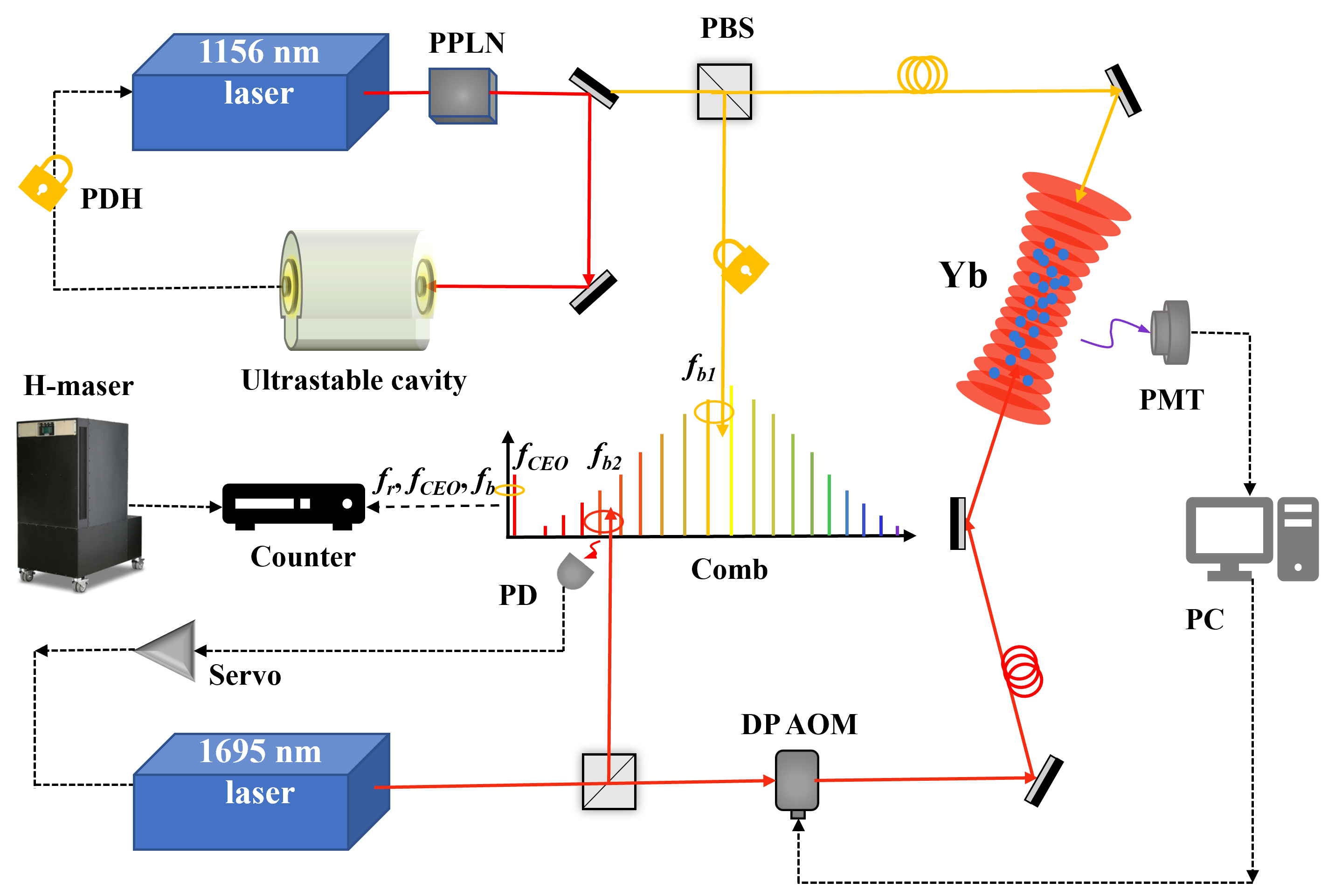 从图1可见,该实验共计需要从紫外到红外不同波长的八套稳定的激光系统,而且要求各激光器能长期稳定运行,特别是频率需长时间同时锁定。图2是精确测量新钟跃迁绝对频率的实验装置示意图,实验装置包括激光冷却和光晶格囚禁的冷镱原子系统、两套亚赫兹线宽超稳激光系统、高精度测量光频的光梳系统和提供频率基准的氢钟系统等。课题组目前不仅已独立自主地建立了一套测量跃迁绝对频率的完整实验系统,而且已完全掌握了必需的、所有的关键技术。