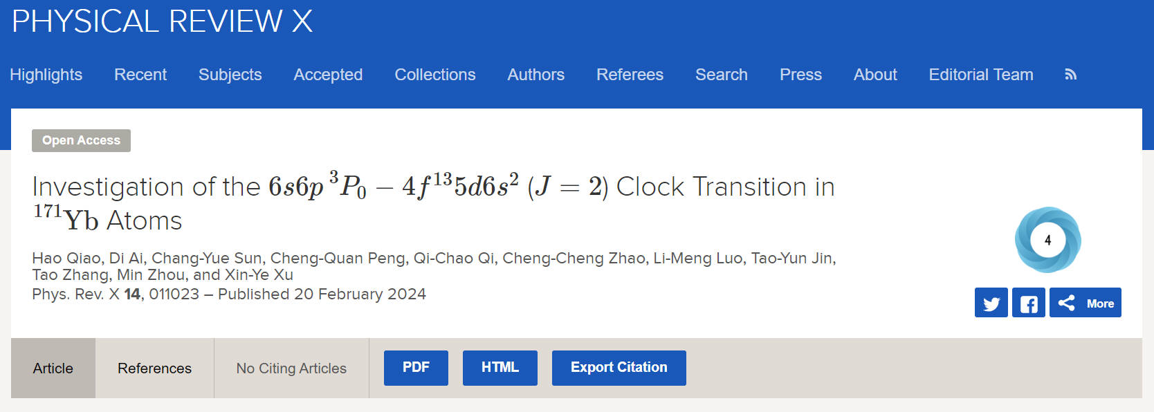 徐信业教授课题组该项研究成果Investigation of the 6s6p 3P0−4f135d6s2 (J=2) Clock Transition in 171Yb Atoms于2024年2月20日在线发表在国际著名学术期刊Physical Review X上。此项工作被审稿人认为是国际上首次对1695nm内壳层镱原子光钟开展了系统全面的实验性研究。博士生谯皓和艾迪为共同第一作者,徐信业教授为唯一通讯作者,完美网页版为第一完成单位。