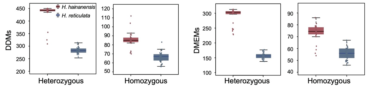 更为重要的是,通过采集坡垒与无翼坡垒样本进行种群基因组分析,发现这2个物种的有效种群大小从约2000年前开始急剧下降,在如此短的时间内下降了至少3个数量级(图3)。这一结果表明人类干扰是导致龙脑香物种濒危的主要原因。因此,保护这类物种的关键是限制采伐、避免土地利用变化等。令人欣慰的是,相较于其他濒危植物,目前这2个物种基因组中积累的有害等位基因较少(图4),有利于这些物种的恢复。