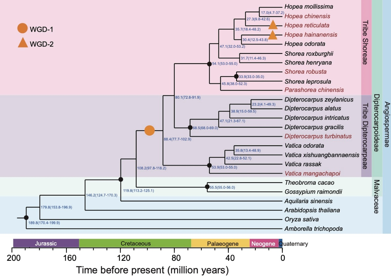 该研究对包括2个同源四倍体物种(坡垒与无翼坡垒)在内的7个龙脑香物种进行全基因组测序,将基因组组装至染色体水平。在此基础上结合已发表基因组分析龙脑香亚科的系统发育关系,龙脑香科植物与锦葵科的分化时间约为1.08亿年前(图2),分化后龙脑香亚科经历了一次全基因组复制事件,而坡垒和无翼坡垒又各自经历了一次全基因组复制。