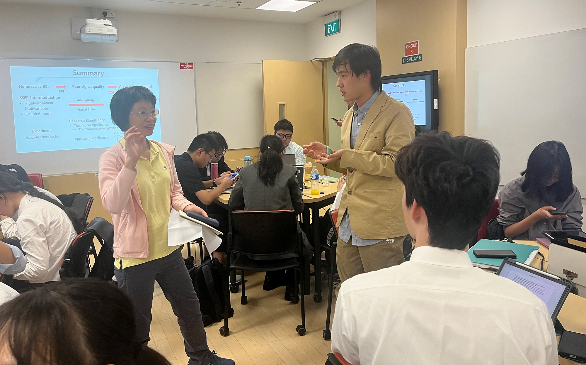 项目最后一天,各小组分别展示了研究成果。汇报以全英文形式呈现,各组研究主题在多元深入的同时,也紧扣当下学术前沿,例如:研究左旋卡巴拉汀及其衍生物的新型合成方法;基于深度学习,展开多感知通道稳态刺激诱发电位多阶耦合模型研究;基于中国部分省市的气温、降水数据,探究气候变化与心理健康之间的关系;研究如何通过聊天AI(chatbot)提升心血管疾病(CVD)患者的生活质量;撰写AI在精神分裂诊断中应用的综述;探究新加坡华人的中文水平和影响其语言能力的各种因素。