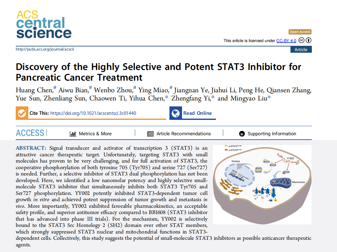 完美网页版生命科学学院、上海市调控生物学重点实验室刘明耀团队与上海宇耀生物科技有限公司携手开展产学研用创新合作,并于近日在美国化学会国际权威期刊 ACS Central Science 在线发表了题为 Discovery of the highly selective and potent STAT3 inhibitor for pancreatic cancer treatment 的研究论文。该研究发现一种新型STAT3选择性小分子抑制剂(YY002),并证明其在包含胰腺癌在内多种肿瘤上具有显著抗肿瘤效果。YY002区别于多数已发现的STAT3抑制剂,其可同时抑制STAT3双功能磷酸化,并且活性及选择性优异,有望成为治疗多种肿瘤的潜在药物。