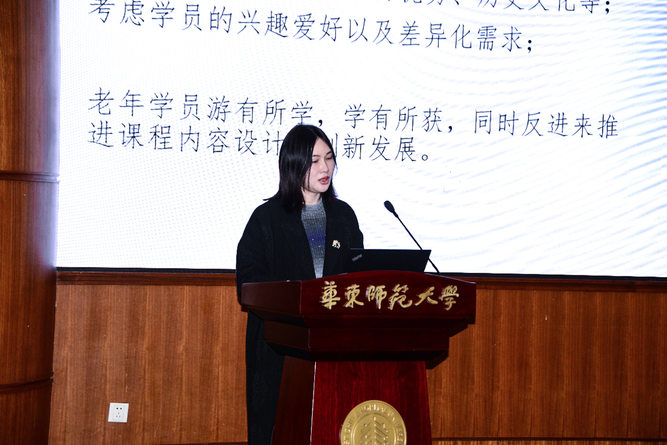 刘清圆作了题为“老年大学开设生命教育课程的实验研究——以《幸福长者生命成长课程》为例”的案例汇报,介绍了上海市松江区社区学院“幸福长者生命成长课程”的相关设计,助力长者提升生命和生活质量。