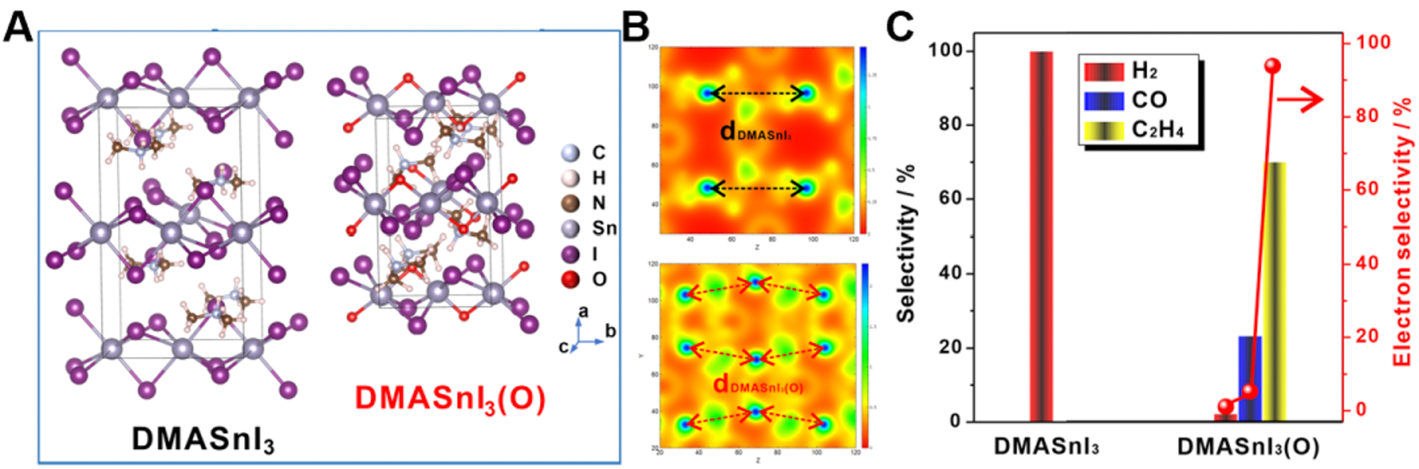 (A, B)DMASnI3和DMASnI3(O)的DFT模型图;(C)DMASnI3和DMASnI3(O)光催化CO2还原产物选择性