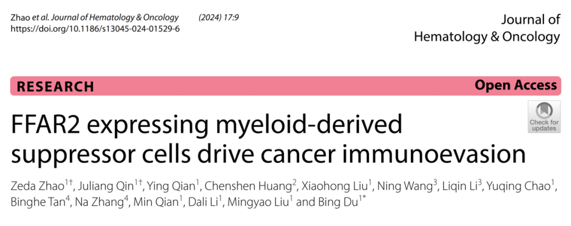 生命科学学院杜冰教授团队发表在 Journal of Hematology & Oncology 上的研究表明,FFAR2敲除可以显著降低MDSCs免疫抑制活性,逆转肿瘤免疫抑制微环境,显著抑制小鼠体内肺癌和黑色素瘤的进展。这些发现预示FFAR2可能成为抑制MDSCs、逆转肿瘤免疫抑制微环境的潜在新靶点,在提升临床肿瘤免疫治疗效果方面具有巨大潜力。