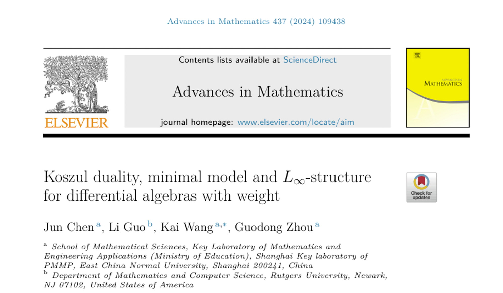 数学科学学院周国栋教授团队于2024年2月在 Advances in Mathematics 上正式发表题为 Koszul duality,minimal model and L∞-structure for differential algebras with weight 的研究工作,首次给出非零权微分代数的operad的极小模型,进而导出控制非零权微分代数形变的李无穷代数与微分代数的同伦版本,完整地回答了法国数学家Loday提出的一个公开问题。
