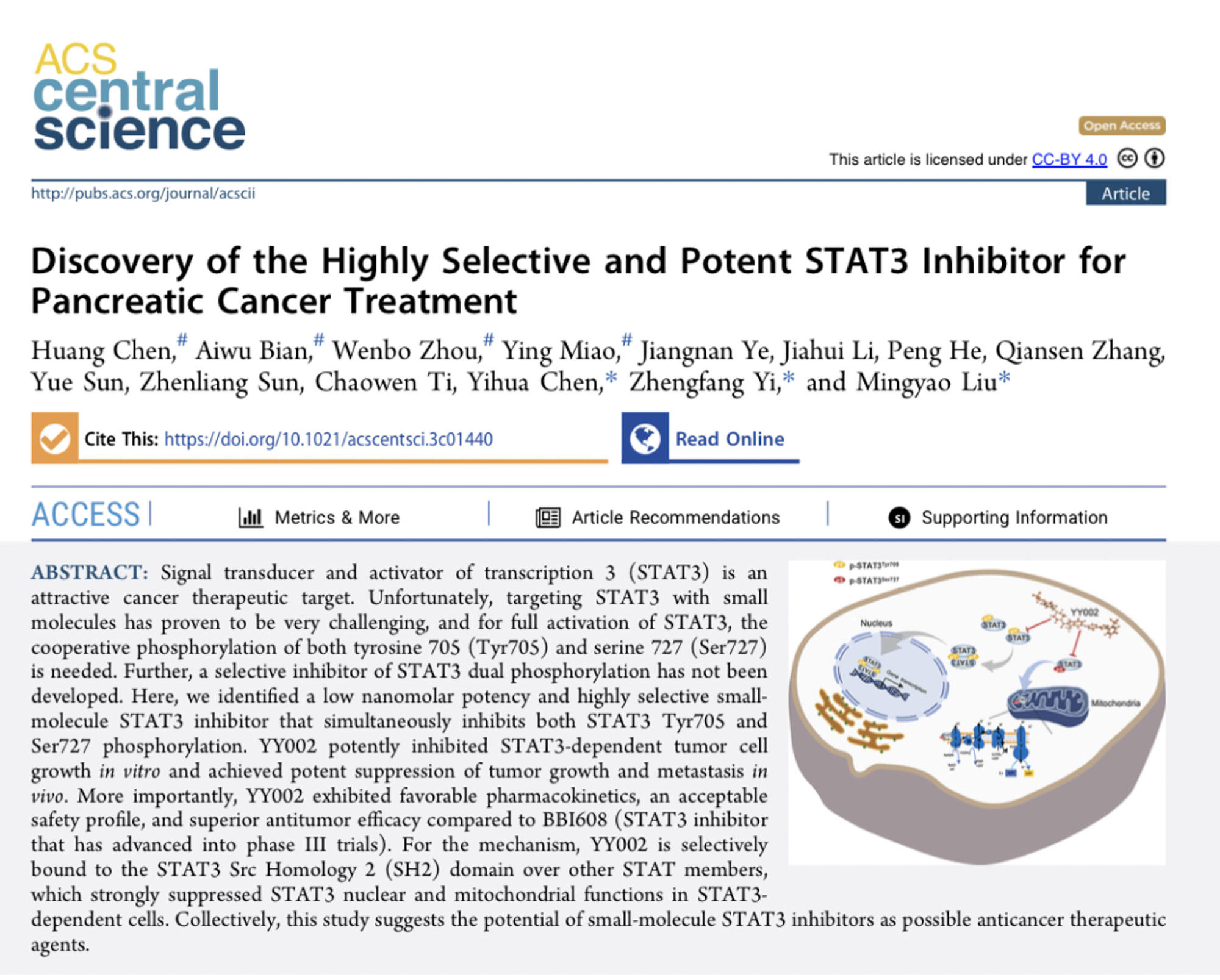 完美网页版生命科学学院刘明耀教授团队与上海宇耀生物科技有限公司携手开展产学研用创新合作,近期在美国化学会国际权威期刊 ACS Central Science在线发表研究论文 Discovery of the highly selective and potent STAT3 inhibitor for pancreatic cancer treatment。
