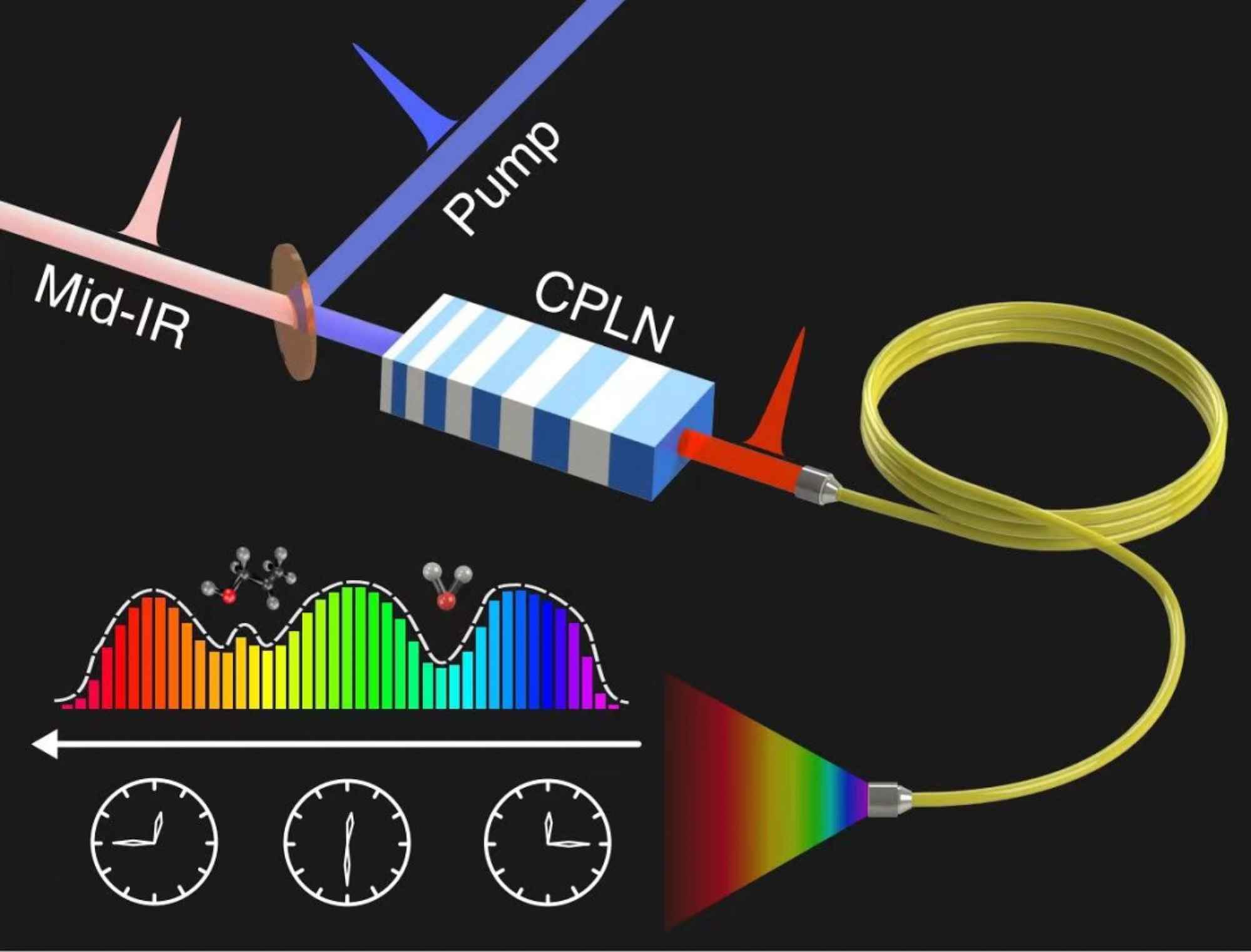 精密光谱科学与技术国家重点实验室曾和平教授与黄坤研究员团队在超灵敏中红外光谱探测方面取得重要进展,发展了宽波段、高分辨、超灵敏的中红外上转换时间拉伸光谱测量技术,展示了单光子探测灵敏度与亚波数光谱分辨率,可为痕量检测、红外遥感和医学诊断等应用提供有力支撑。
