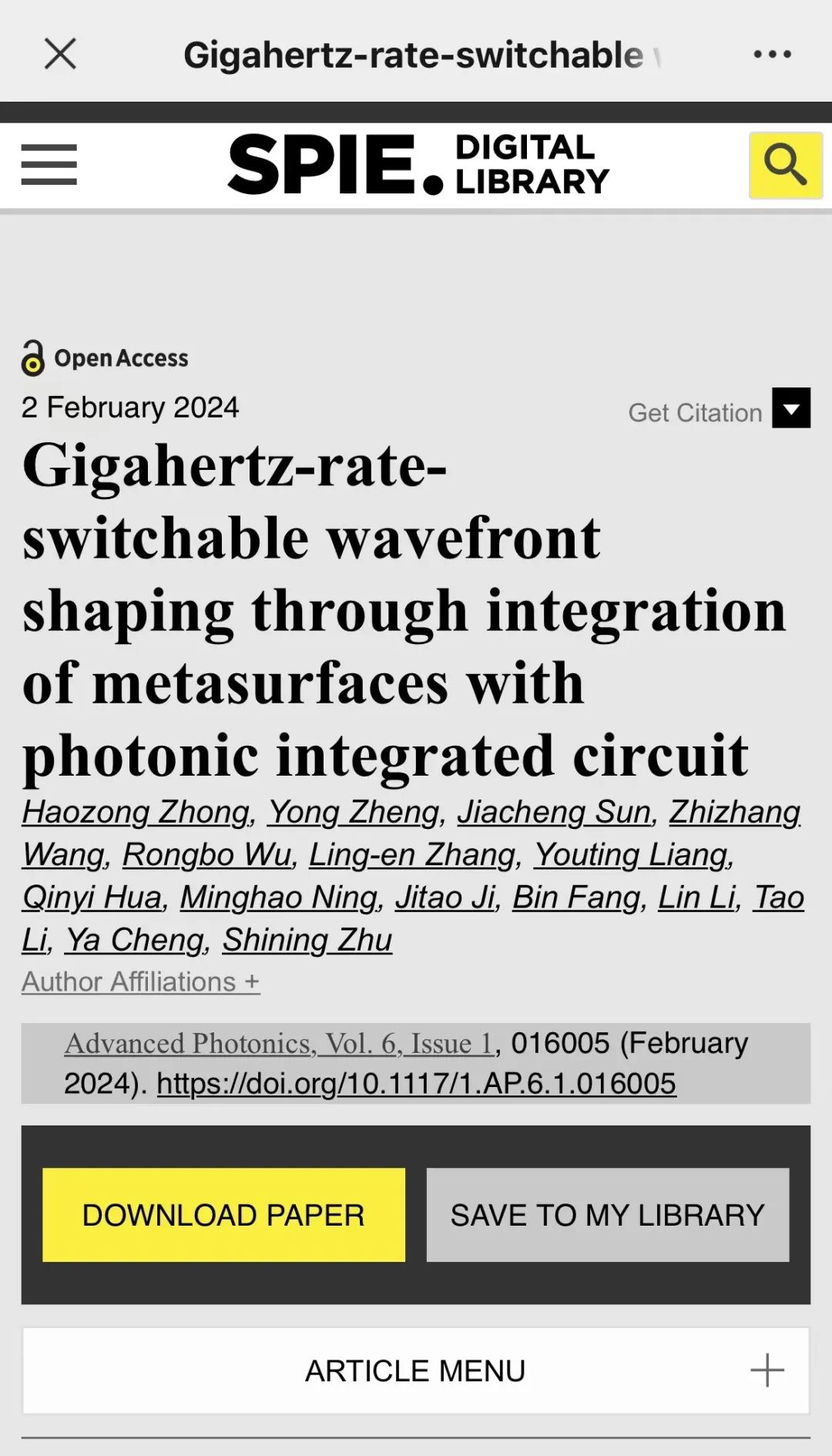 高速、高效的多自由度动态光场调控是光学领域一个重要挑战。近期,完美网页版精密光谱科学与技术国家重点实验室程亚教授和李林研究员团队与南京大学的科研人员合作,通过将超构表面与铌酸锂薄膜(LNOI)集成光子芯片结合,实现了光场的高速动态调控,并首次成功展示了GHz级可切换的波前整形,为高速动态光场调控提供了全新的思路。相关工作发表于 Advanced Photonics,研究生钟浩宗、郑勇、孙嘉程为本文共同第一作者,程亚教授、李林研究员为共同通讯作者。