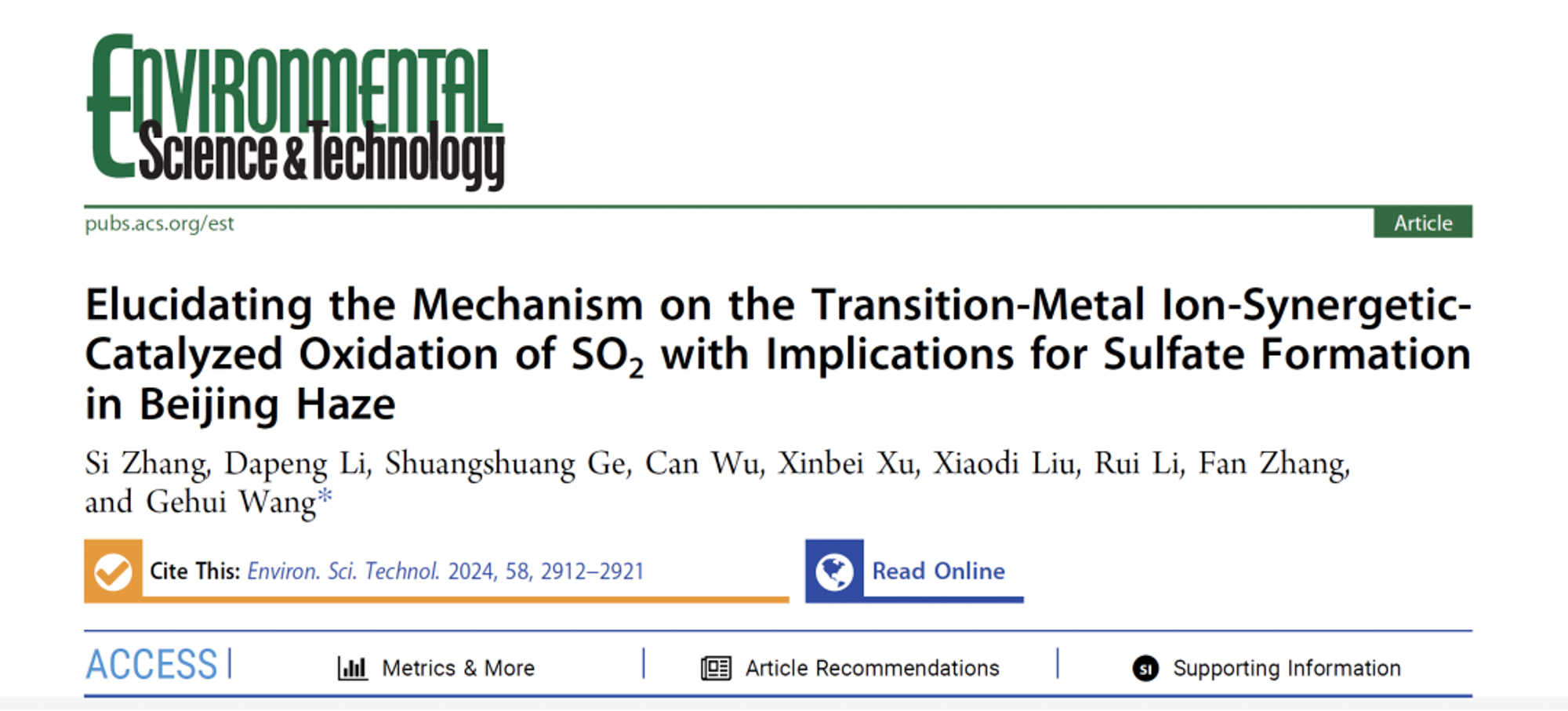 硫酸盐是引发我国冬季大气霾污染的重要物质,然而关于大气中硫酸盐气溶胶形成机制的认识仍旧不清楚。地理科学学院王格慧教授团队通过实验室烟雾箱模拟并结合外场观测,系统揭示了过渡金属协同催化O2氧化SO2形成硫酸盐的过程及影响因素,定量比较了北京冬季大气硫酸盐的不同反应路径,进一步深化了对我国华北平原霾污染成因的认识。