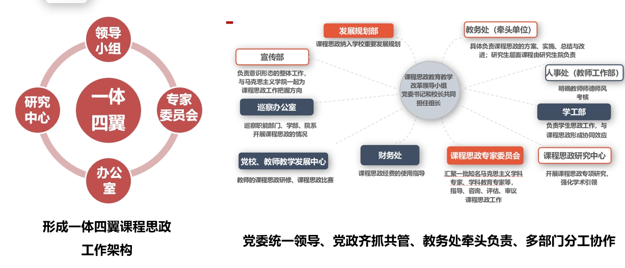 强化顶层设计。明确课程思政建设是“一把手”工程,成立课程思政研究中心并由校党委书记担任中心主任,与领导小组、专家委员会、办公室构成“一体四翼”的工作格局;进行“一盘棋”部署,将课程思政建设纳入学校发展规划和卓越育人方案,纳入专业、教材、课程和教师队伍建设要求,与一流大学建设同部署同推进;设立“一揽子”保障,组建由国家万人计划教学名师、长江学者等组成的多学科研究和实践队伍,出台《深化课程思政教育教学改革实施意见》《课程思政组织机构运行细则》等一系列规范性文件。