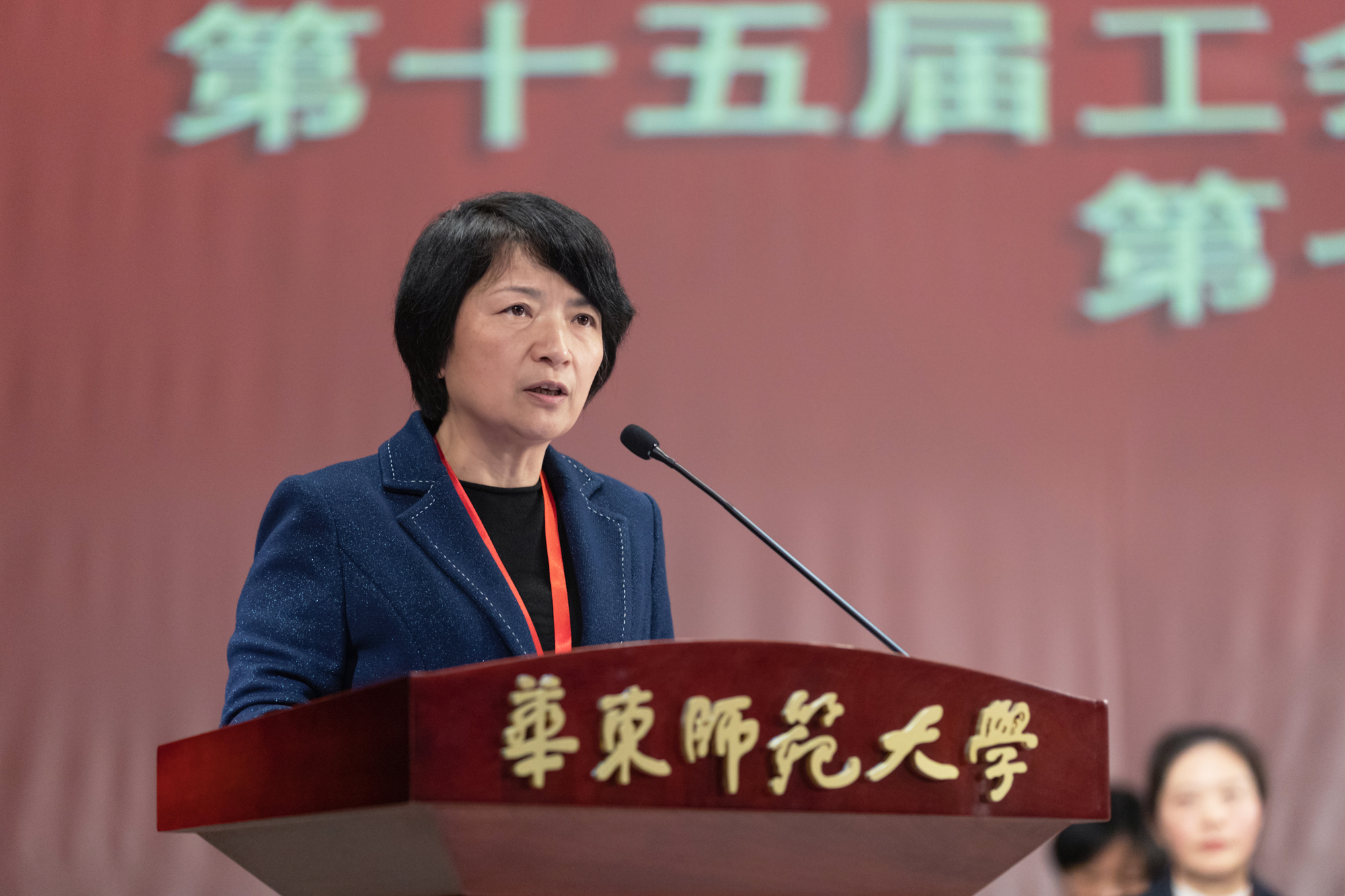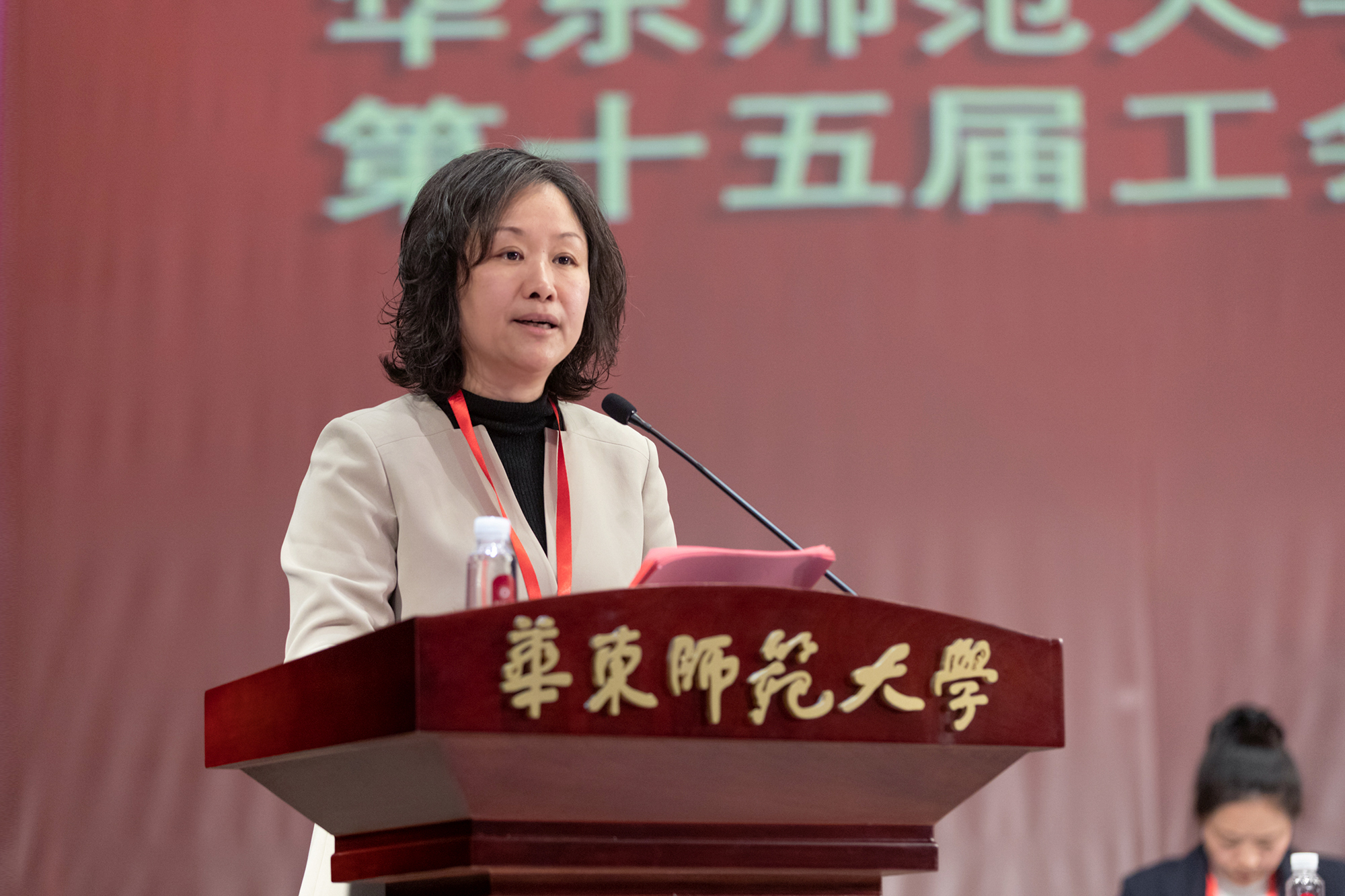 校党委常委、副校长、工会主席程静代表校第八届教代会执行委员会和第十四届工会委员会作了题为《不忘初心, 砥砺前行,为加快建设引领育人创新的中国特色世界一流大学汇聚磅礴力量》的工作报告