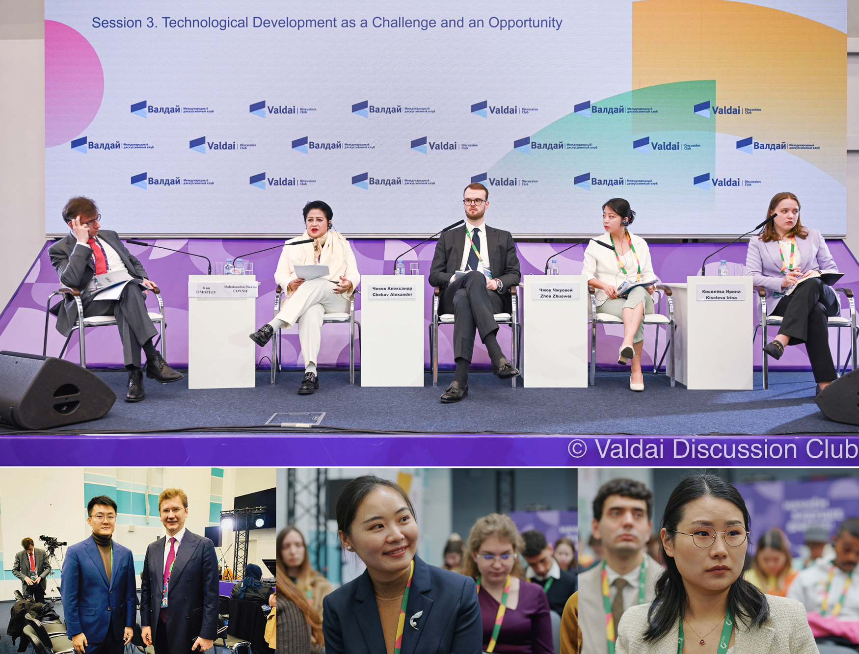 第三场研讨以“技术进步对文明的挑战和机遇”为题,由瓦尔代俱乐部项目主任、俄罗斯国际事务委员会总干事伊万·季莫费耶夫(Ivan Timofeev)主持。俄罗斯量子中心科学组组长伊利娅·谢梅里科夫(Ilya Semerikov)、南非茨瓦内理工大学创新经济研究所所长拉希姆·玛哈拉杰(Rasigan Maharajh)、数字印度基金会负责人兼联合创始人阿文·古普塔(Arvind Gupta)作主题发言。资深专家和在场青年学者围绕人工智能、技术主权、新殖民主义等关键词,探讨科技革命背景下人类世界,特别是发展中国家面临的机遇与挑战。