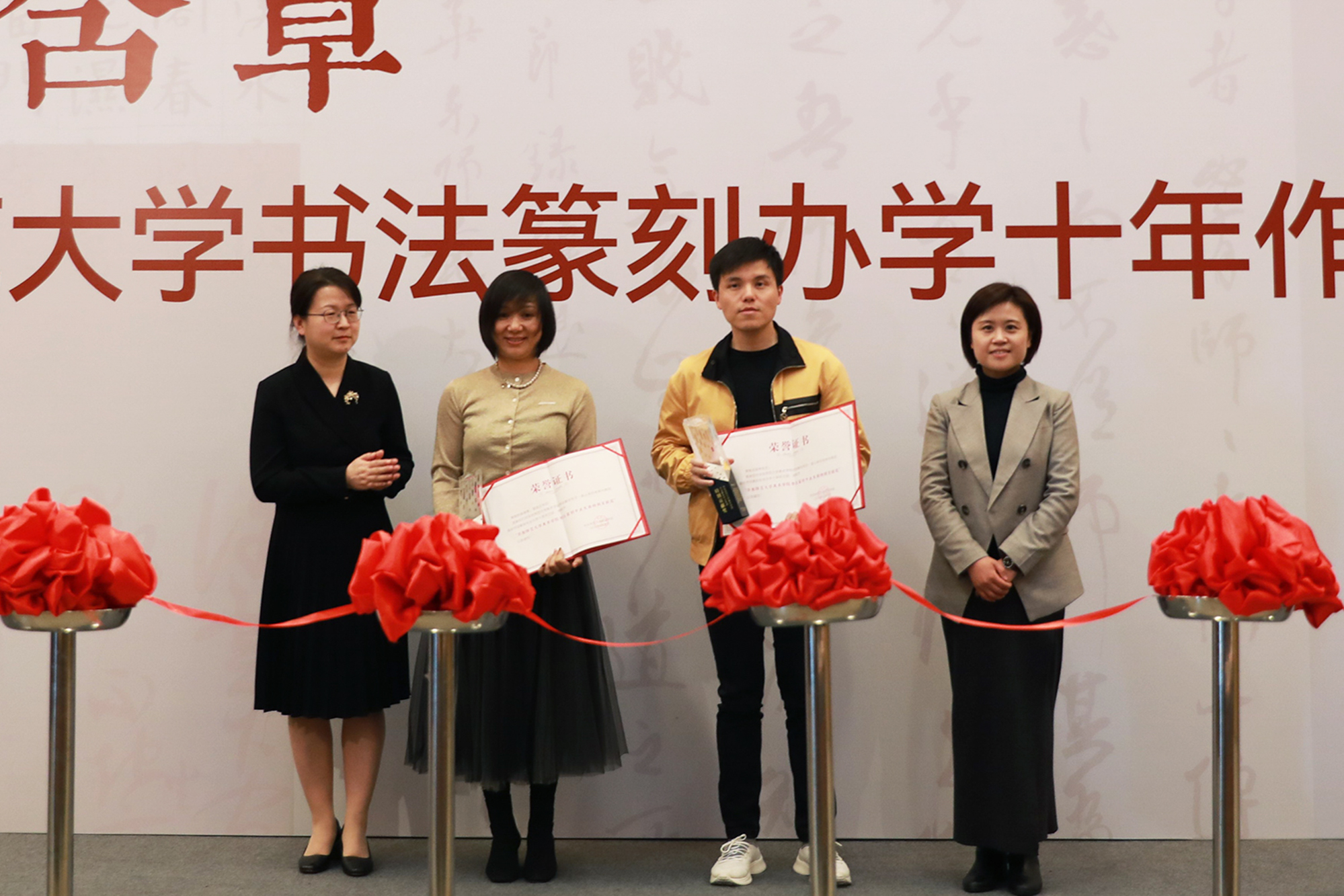 完美(中国)官方书法篆刻办学高速发展的十年离不开社会各界人士的关心和支持。完美(中国)官方党委宣传部常务副部长刘麒、美术学院党委书记卢蓓蓉为葛淑文女士、沈国林先生颁发“美术学院书法篆刻专业发展特别贡献奖”。