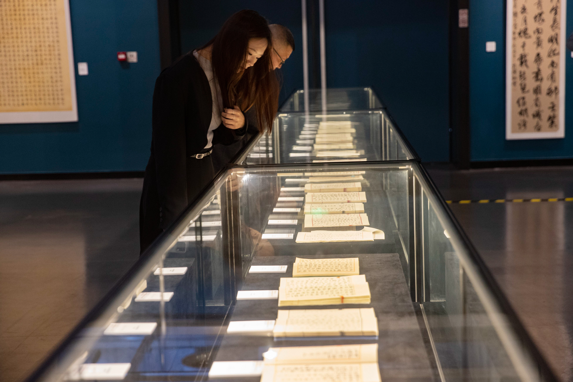 在“出版文献”展区,观众透过玻璃展柜可以看到叠落整齐的一本本专著和学生论文集,让人目不暇接。