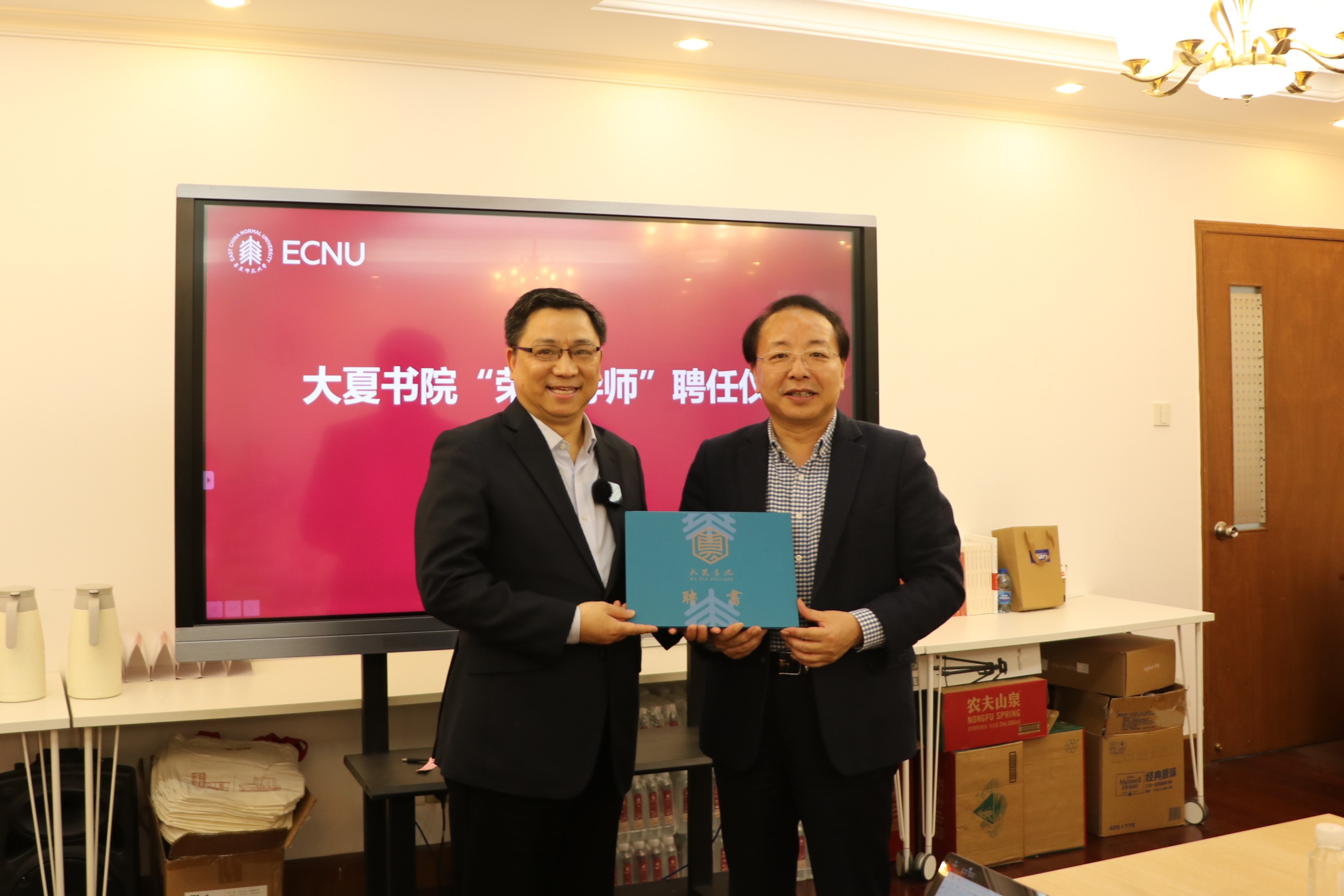 大夏书院院长庞维国教授为汤涛馆长颁发大夏书院“荣誉导师”聘书