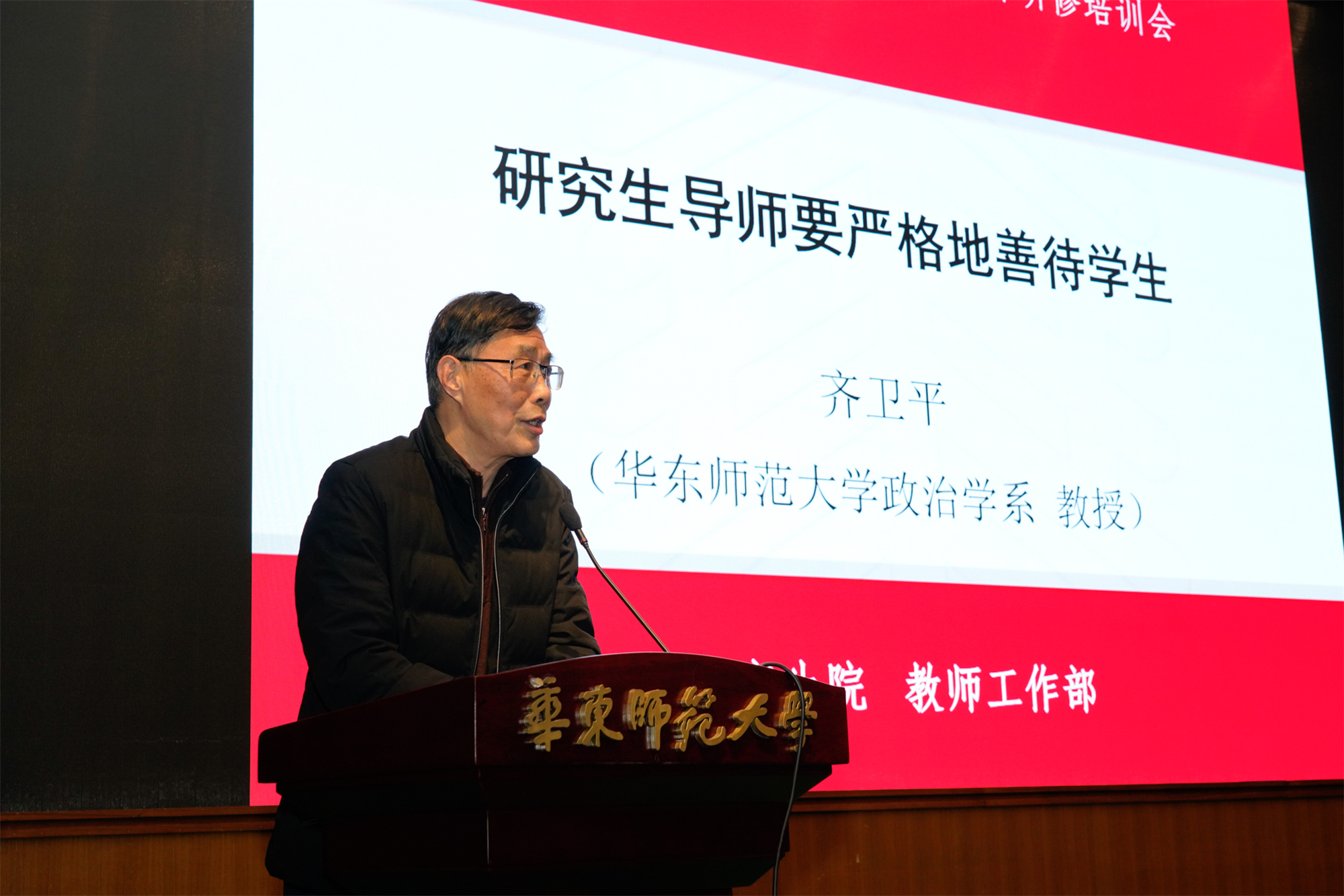 张文在主持中,简要介绍了我校研究生教育的历史与现状,强调贯彻《教育部关于全面落实研究生导师立德树人职责的意见》,研究生导师肩负着培养国家高层次创新人才的使命与重任,在研究生培养过程中,应坚持社会主义办学方向,坚持“四个”相统一,全过程育人、全方位育人,做好研究生成长成才的指导者和引路人。他同时指出,作为研究生导师上岗的必须环节,研修班每年定期举办,通过专题报告、经验分享等形式,让导师尽快熟悉研究生教育的使命与目标,了解研究生培养的特点与规律,增强导师的责任意识和育人能力,充分发挥导师“第一责任人”作用,全面落实立德树人根本任务。