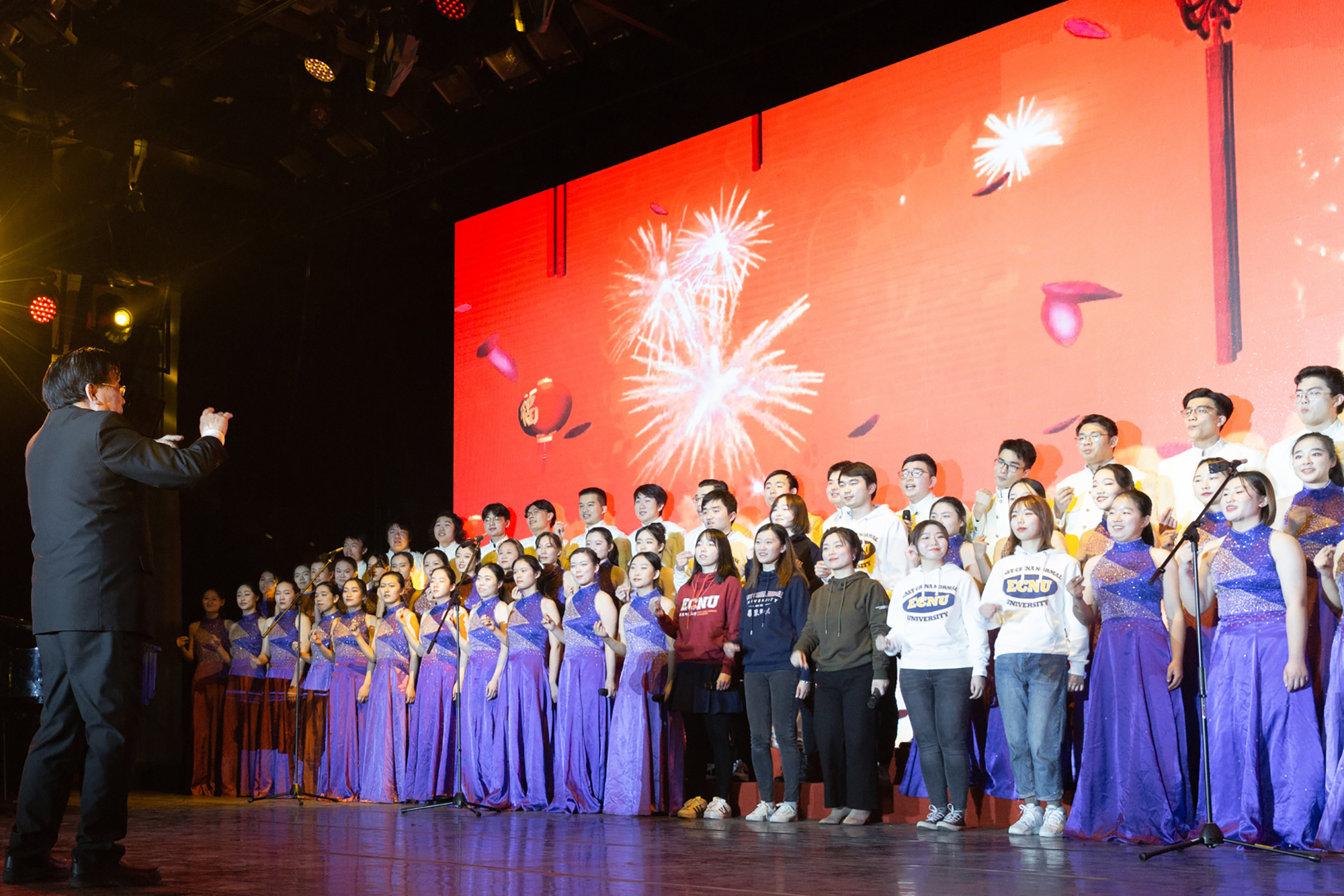 晚会由传播学院学生席森培、杜金芮主持,在民乐团《沿着社会主义大道奔前方》激昂欢快的丝竹笙箫中拉开了序幕。《欢腾的节目》弦乐、管乐、弹拨声部遥相呼应,把锣鼓喧天的热闹场面带到了观众眼前。舞蹈团用当代与民族结合的《红扇》庆祝红红火火的中国年,清新灵动的《傣家的女儿傣家的雨》、独舞《狂歌行》表达了对锦绣中国美的赞歌。民乐团除了铺垫开场浓郁的节日氛围之外,还用《打虎上山》《敦煌》以及打击乐团的《云之南》展现了祖国大好河山的壮丽,话剧团出品的《说说我的国》用华师学子的视角诉说了对祖国的深情守候。合唱团的同学们则用《森林公主》将我们带回纯真年代,又用阿卡贝拉的形式献上《somebody that I used to know》。全团挚爱的《我像雪花天上来》唱柔情百转、颂深情千回。最后,合唱团全体团员用无伴奏合唱形式演唱的《春节序曲》作为新年贺词,祝愿来年红红火火、辉煌灿烂。晚会的最后,舞蹈团全体团员在悠扬振奋的音乐声中轻盈跃动,似浪花激励所有人《奋楫起航》。
