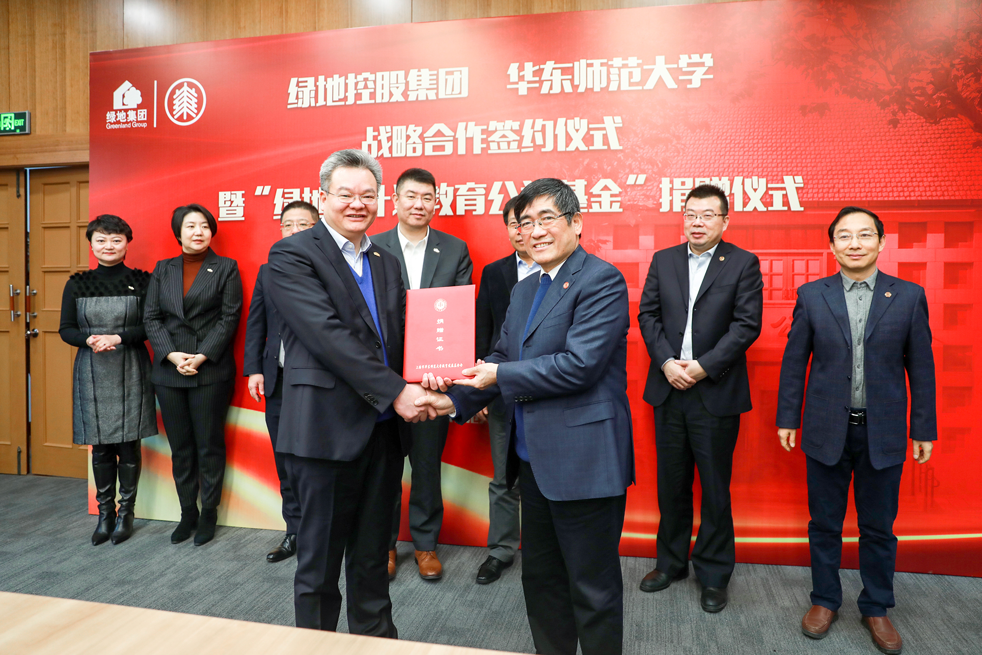 学校教育发展基金会理事长童世骏接受捐赠支票并为绿地集团代表颁发捐赠证书