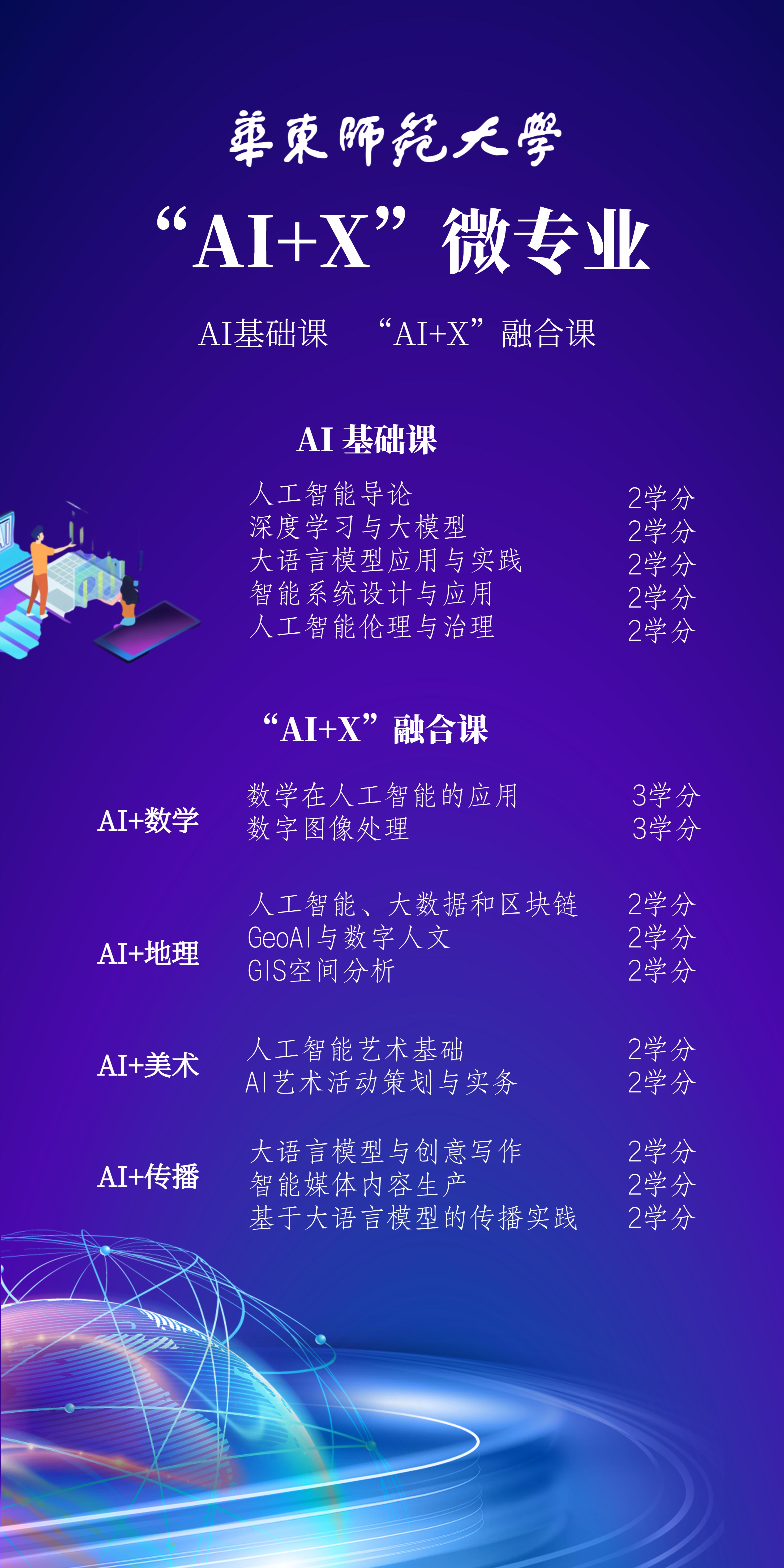 “AI+X”微专业课程设有AI基础课与“AI+X”融合课两个模块,未来将覆盖所有专业。首批推出“AI+数学”“AI+地理”“AI+美术”“AI+传播”四个专业领域。“AI+X”微专业的设立,标志着人工智能与专业课程的深度融合,并为专业的创新发展注入了新的活力。