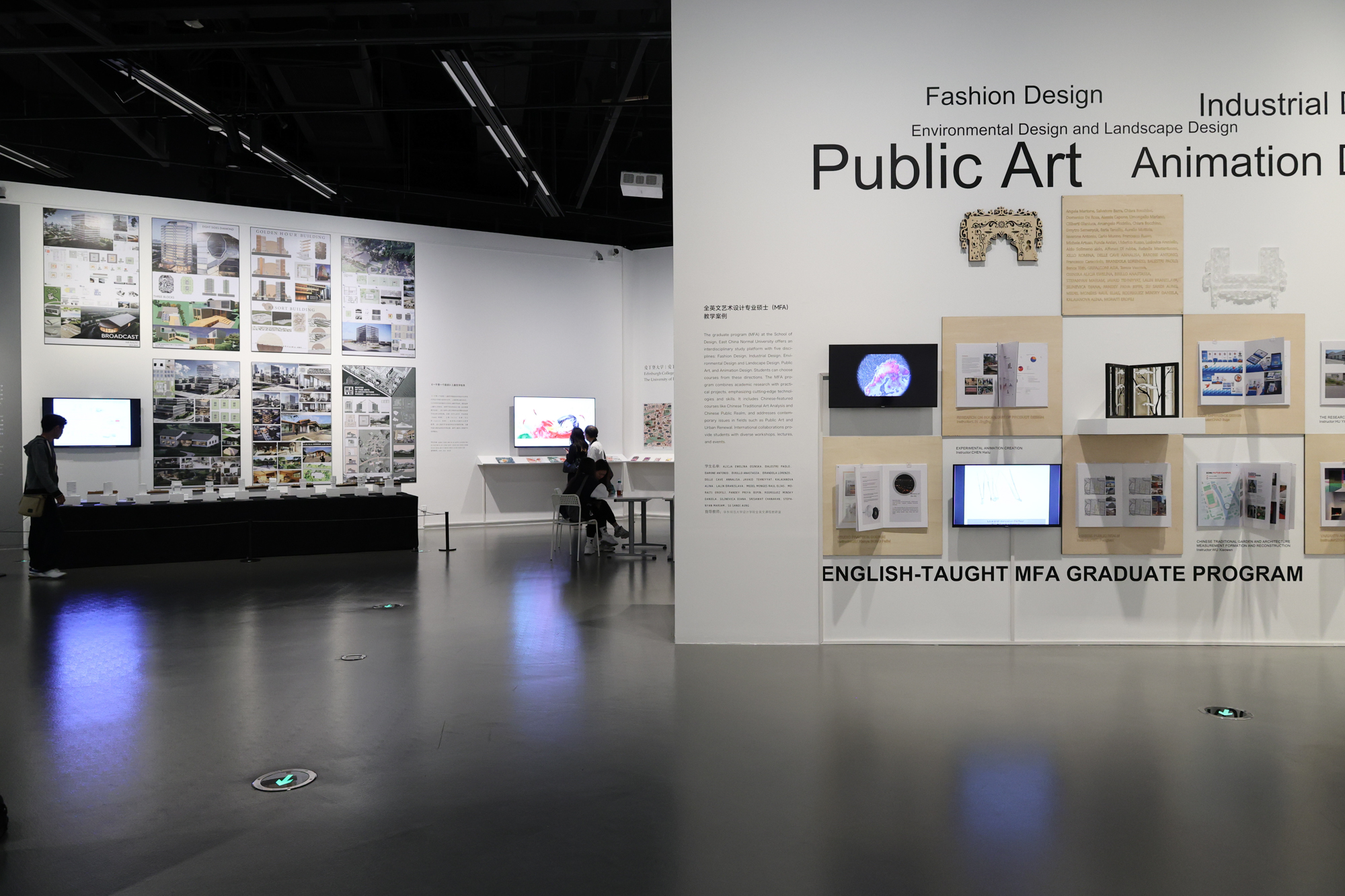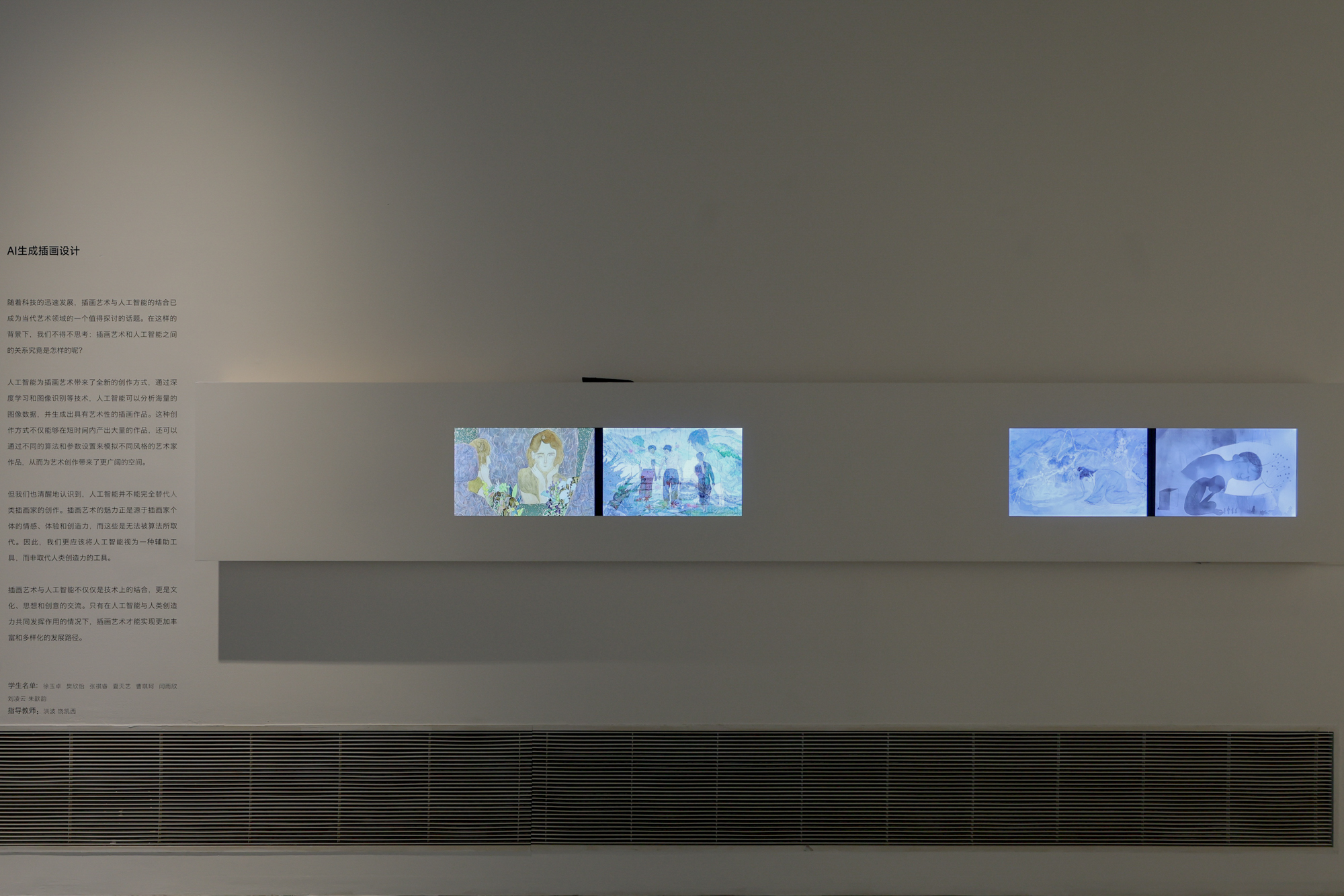 展览分为五个部分,第一部分展现的是设计学院人工智能设计教学的成果;第二部分展示学院国际化办学与项目实践课程教学改革的成果;第三部分展示的是学院各个专业和专业方向学生的日常课程作业和作品;第四部分展示的是学院师生的科研与社会服务成果;第五部分展示的是学生设计的游戏、互动装置等作品。