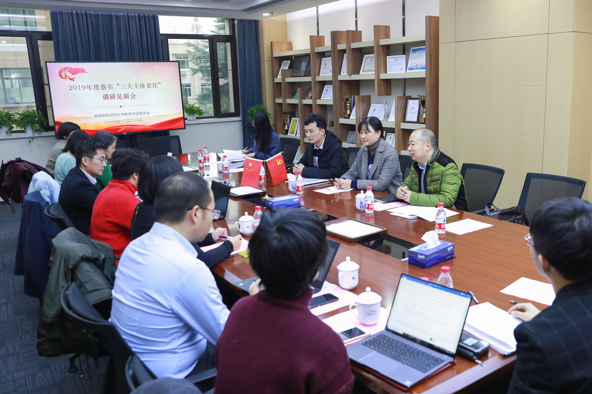 见面会后,调研组分别与学校党政领导班子成员、“三大主体责任”相关部门负责同志、二级单位党政负责人和党支部书记、师生员工代表等进行了个别访谈;认真查阅了“三大主体责任”支撑材料;赴教育学部党委、经管学部党委进行了延伸走访调研,全面了解学校落实“三大主体责任”的情况,收集相关意见建议。