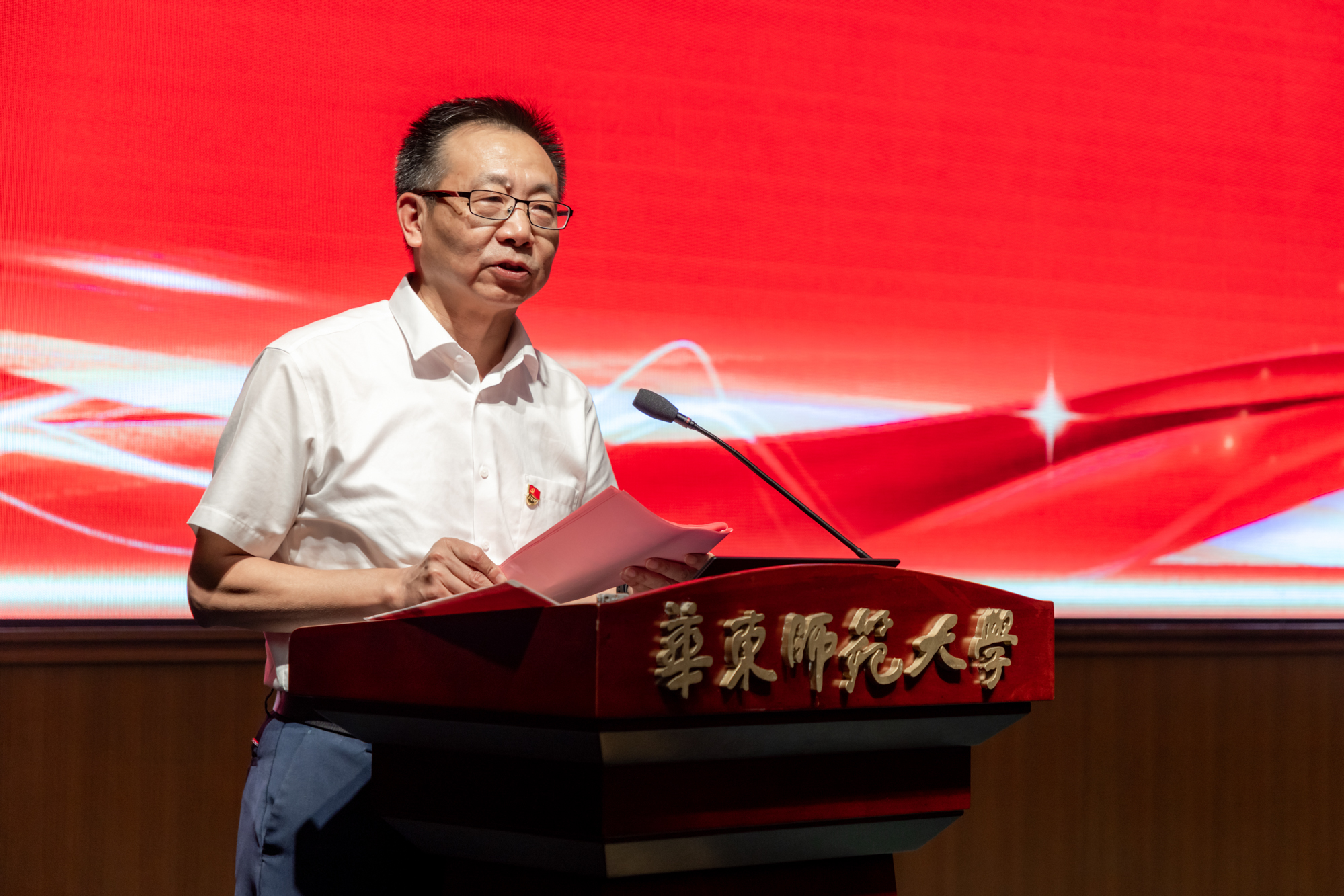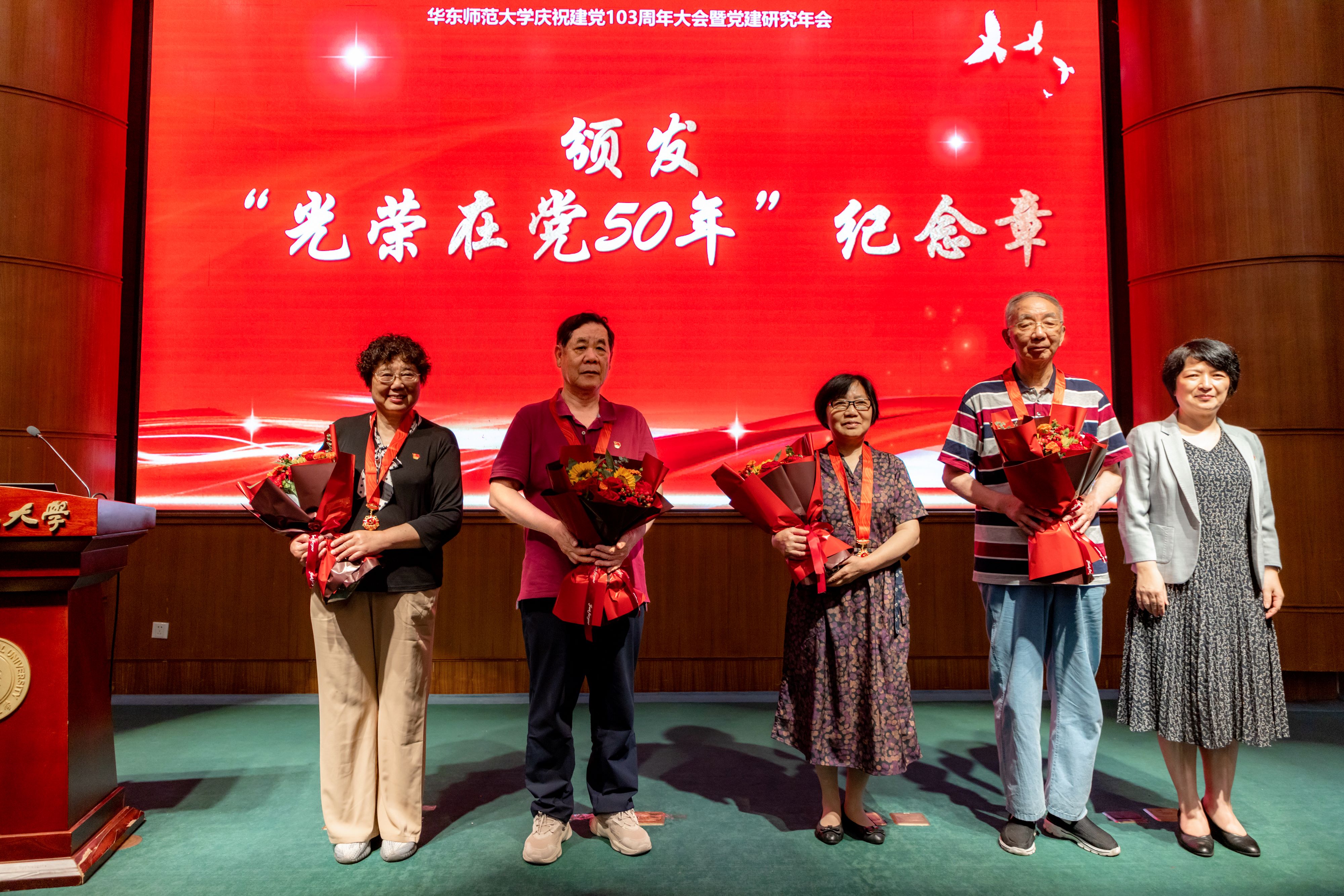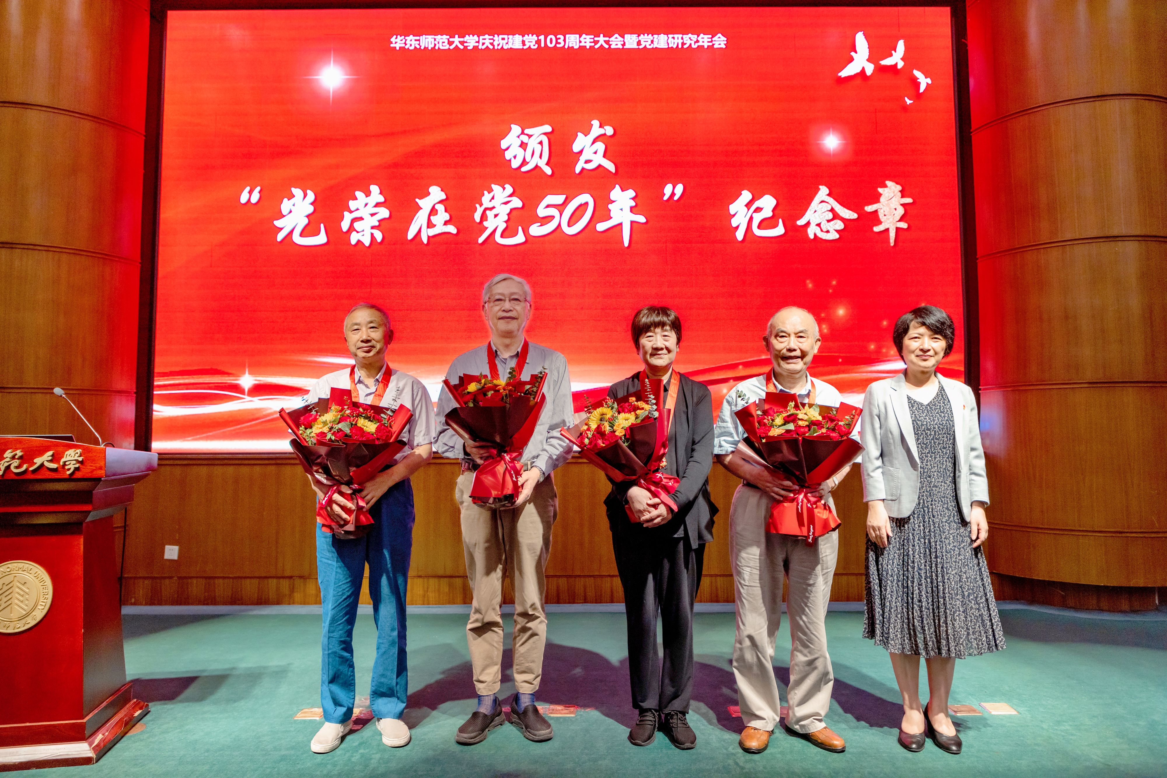 大会邀请了其中的8位老同志——哲学系退休党支部李似珍、开放教育学院退休第四党支部祝智庭、经济与管理学院退休党支部徐丽华、物理与电子科学学院退休党支部朱鋐雄、生命科学学院退休党支部徐宏发、退休局级干部党支部范军、机关退休第一党支部朱小怡、第二附属中学退休党支部顾朝晶作为代表与会。梅兵为老同志颁发了“光荣在党50年”纪念章。