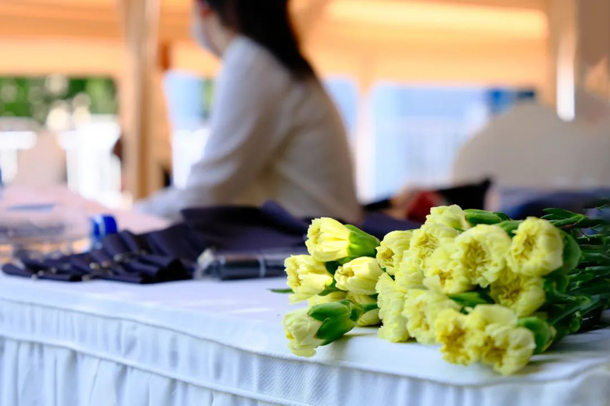 龙华殡仪馆大厅内庄严肃穆,施平同志的遗体覆盖着中国共产党党旗,安卧在鲜花丛中。
