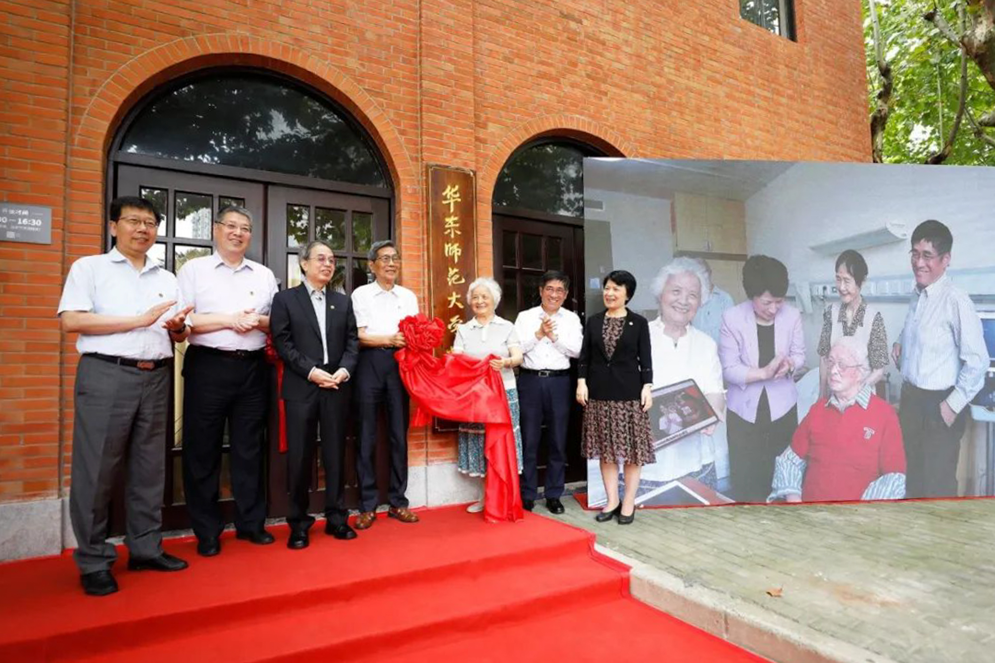 和在开馆仪式现场的原校党委书记张济顺、童世骏,原校长张瑞琨、王建磐、俞立中,以及校党委书记梅兵、校长钱旭红,共同为新校史馆揭幕