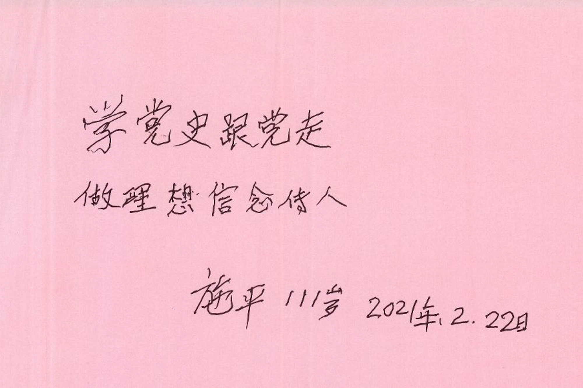 2021年2月18日,在建党100周年来临之际,习近平总书记给上海市新四军历史研究会百岁老战士们回信,赞扬了新四军老战士光荣的革命历史贡献和深厚的爱党之情,“希望老同志们继续发光发热,结合自身革命经历多讲讲中国共产党的故事、党的光荣传统和优良作风,引导广大党员特别是青年一代不忘初心、牢记使命、坚定信仰、勇敢斗争,为新时代全面建设社会主义现代化国家而不懈奋斗”。施平同志作为新四军老战士备受鼓舞,深情回忆了自己参加革命的经历,热切地为青少年写下了“学党史、听党话,做理想信念传人”的青春寄语,衷心期望青年一代矢志不渝跟党走,把自己的生命融入党和人民的事业,建设更加美好的中国。