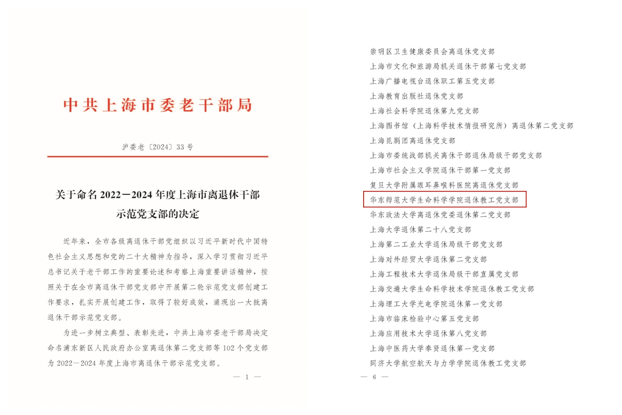 生命科学学院退休教工党支部获2022-2024年度“上海市离退休干部示范党支部”命名