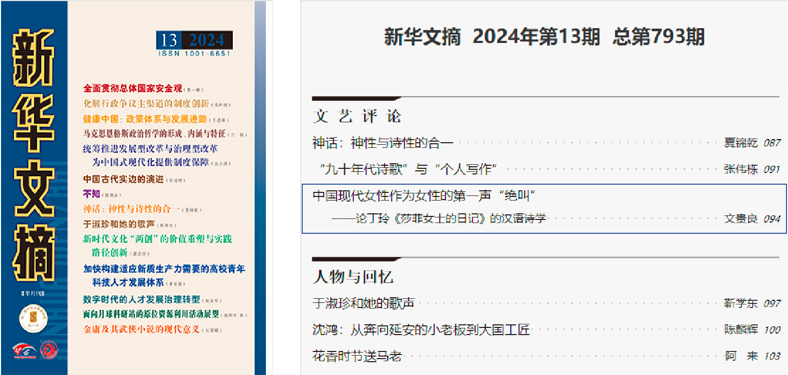 03|文贵良教授文章被《新华文摘》全文转载,探讨丁玲《莎菲女士的日记》的汉语诗学