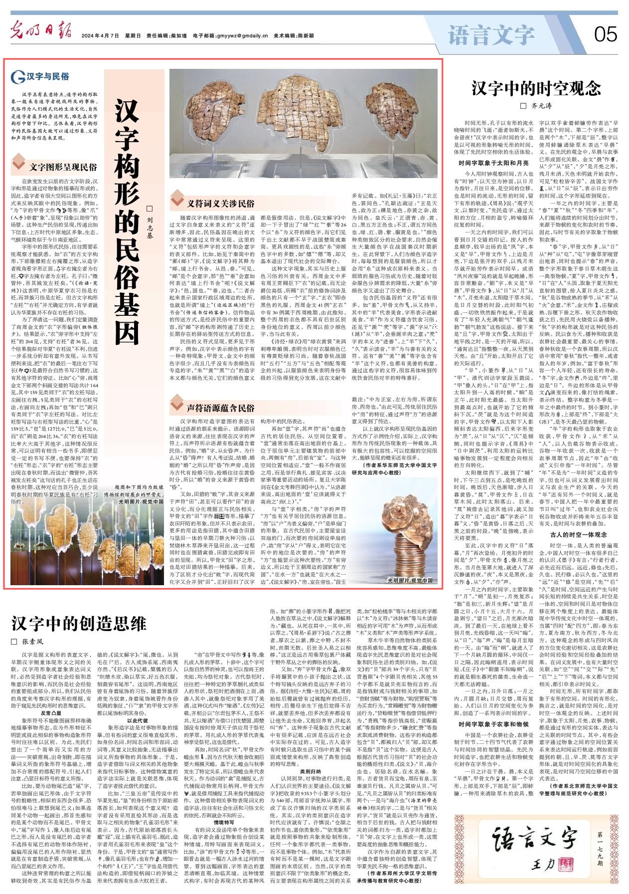 中国文字研究与应用中心刘志基教授《汉字构形的民俗基因》一文刊登在2024年4月7日《光明日报》。