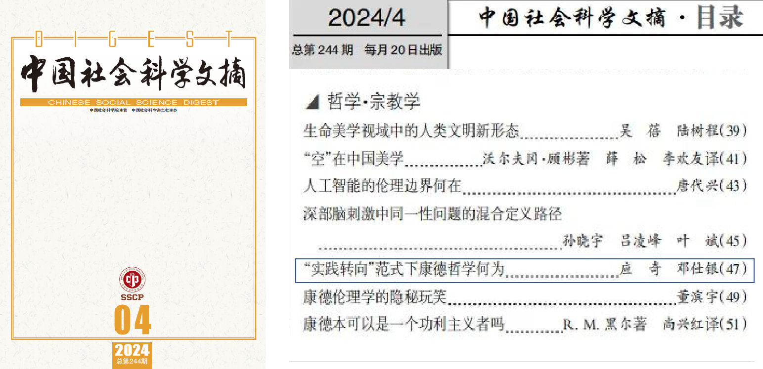 04|应奇教授、博士研究生邓仕银论文被《中国社会科学文摘》全文转载,探讨“实践转向”范式下的康德哲学